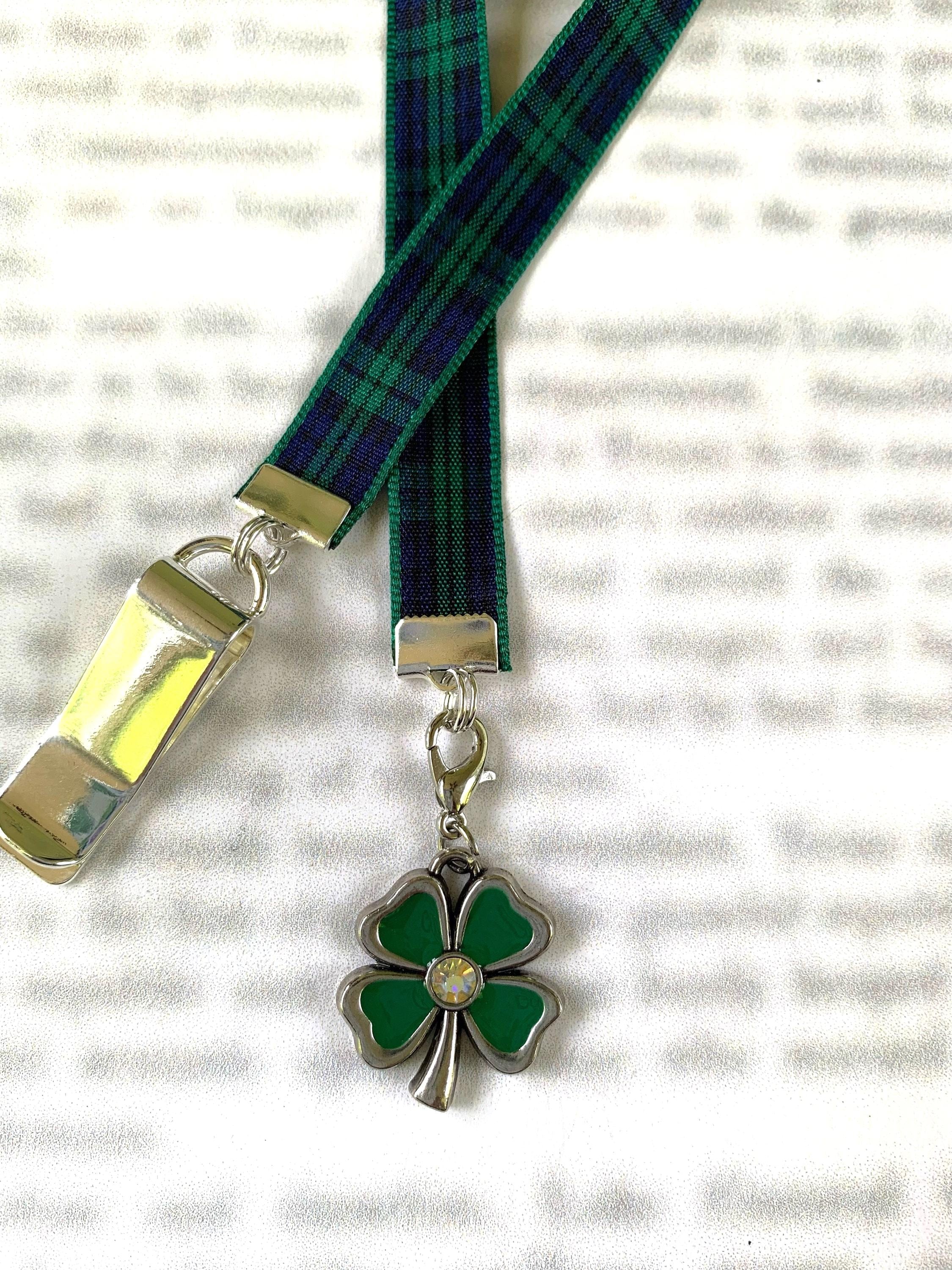 Lucky you to find this green enamel four leaf clover charm, accented with a sparkling crystal. Ribbon is a blue and green blackwatch plaid and is 3/8" wide and approximately 12” in length to accommodate various book sizes.