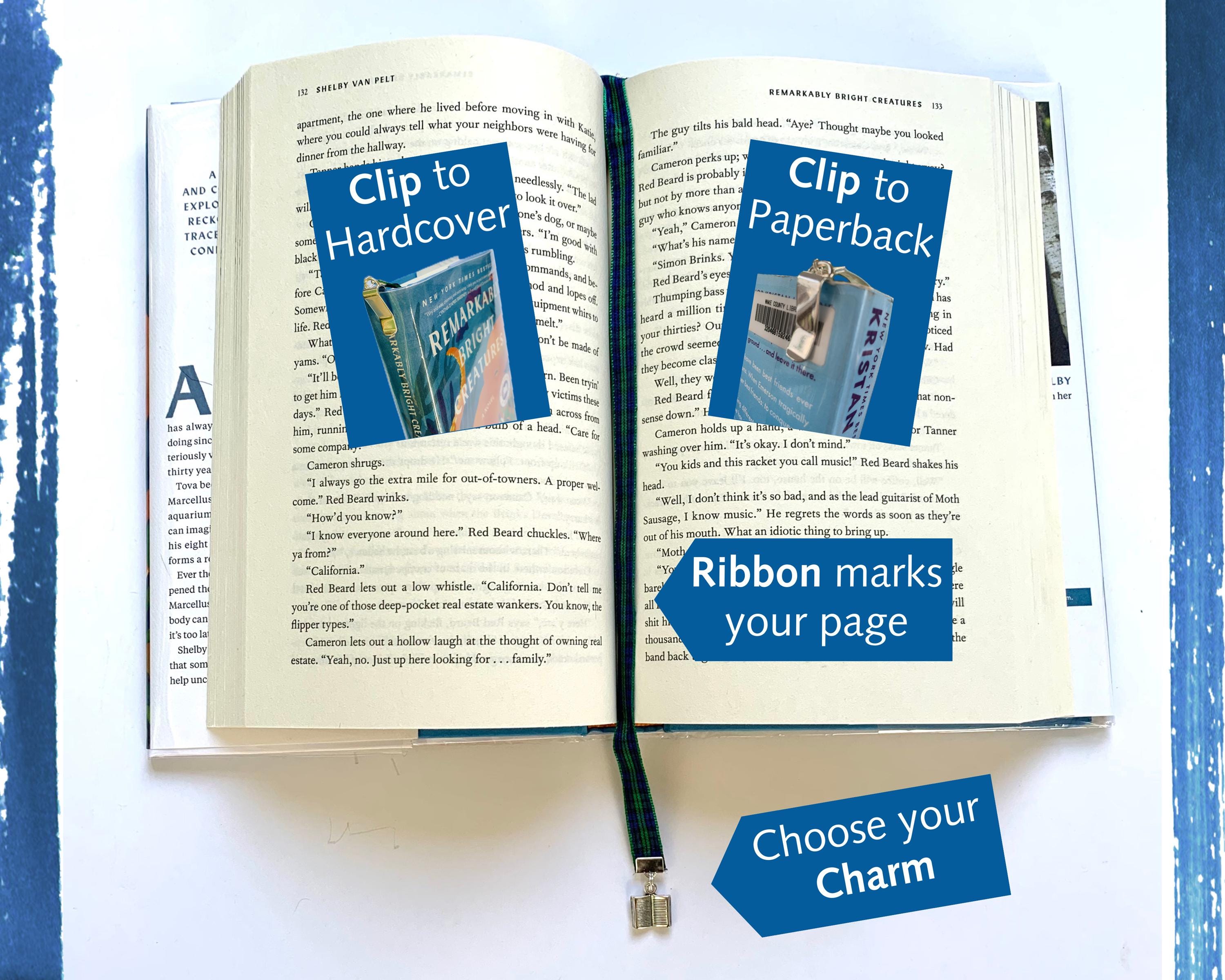 Clover bookmark by Charming Book Clips. My patented design featuring a special silver clip that attaches to your book cover so you never lose your bookmark. Just slide the clip onto the cover of a paperback or the binding of a hardcover when you start your book, then mark the page with the ribbon.
