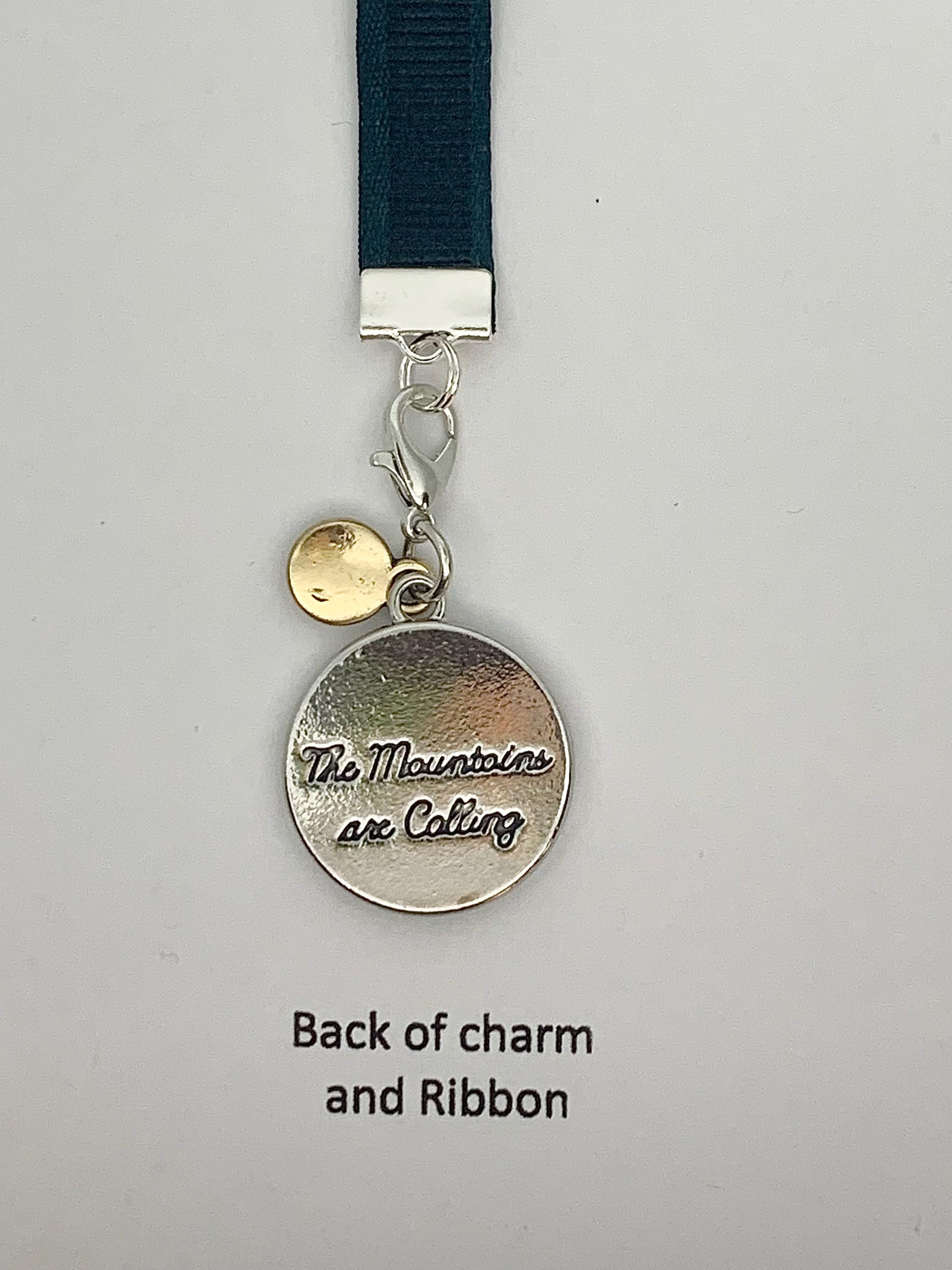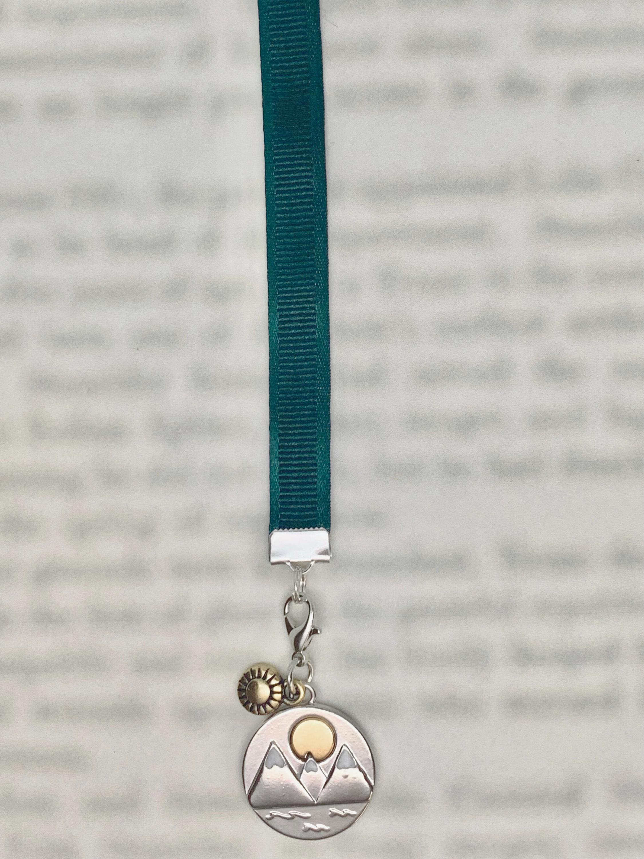 As majestic as the mountains it represents, this medallion charm is made of mixed metal silver and gold tone with white enamel depicting the peaks. There is also a dangle sun mini charm attached. The back side of the charm is engraved with The Mountains Are Calling. The ribbon is a deep forest green reminiscent of the evergreens, 12” in length to accommodate various book sizes. Make it extra special by adding a Heart Shaped crystal charm accent in a birthstone or favorite color.