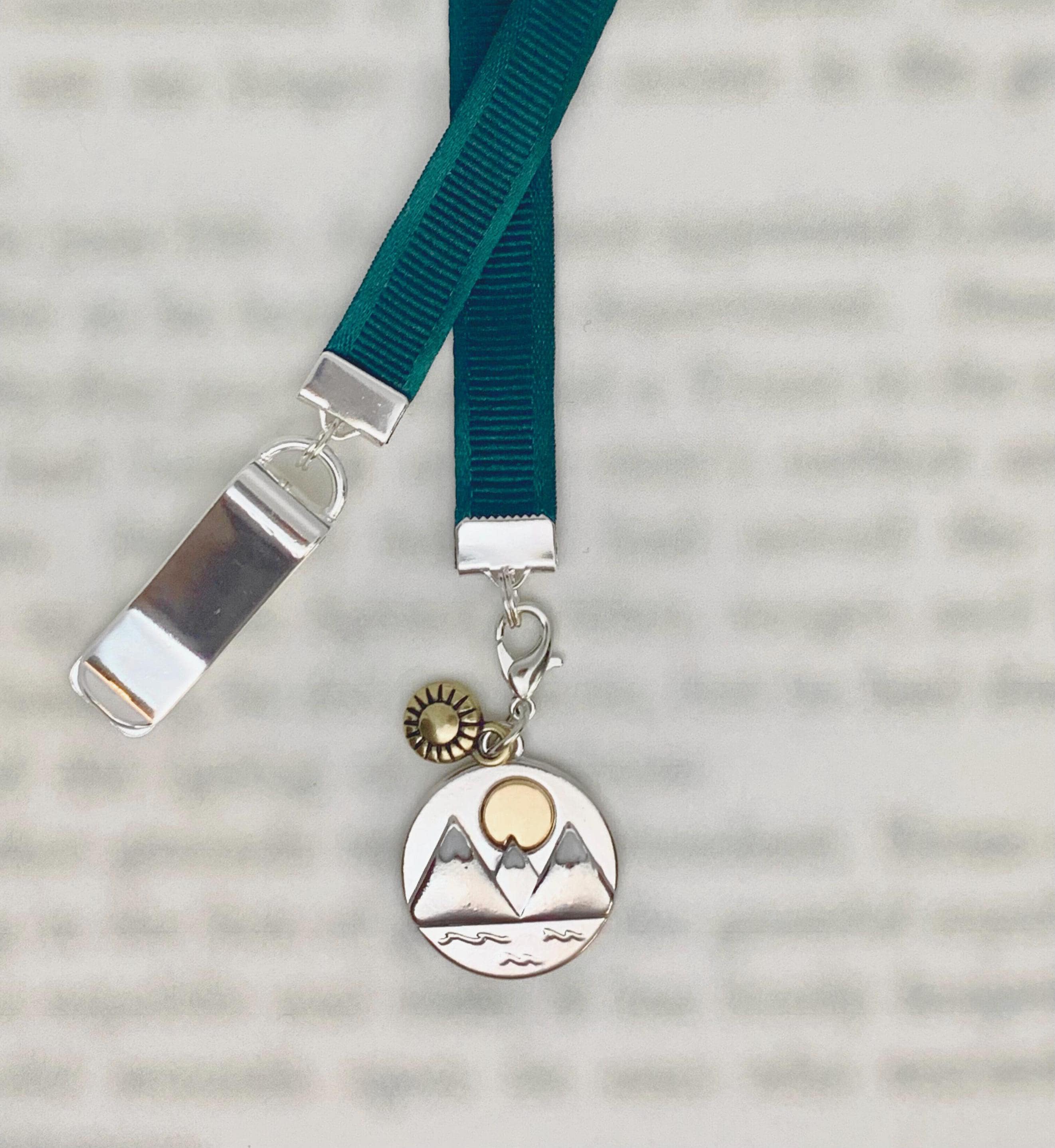 Mountains bookmark by Charming Book Clips. My patented design featuring a special silver clip that attaches to your book cover so you never lose your bookmark. Just slide the clip onto the cover of a paperback or the binding of a hardcover when you start your book, then mark the page with the ribbon.