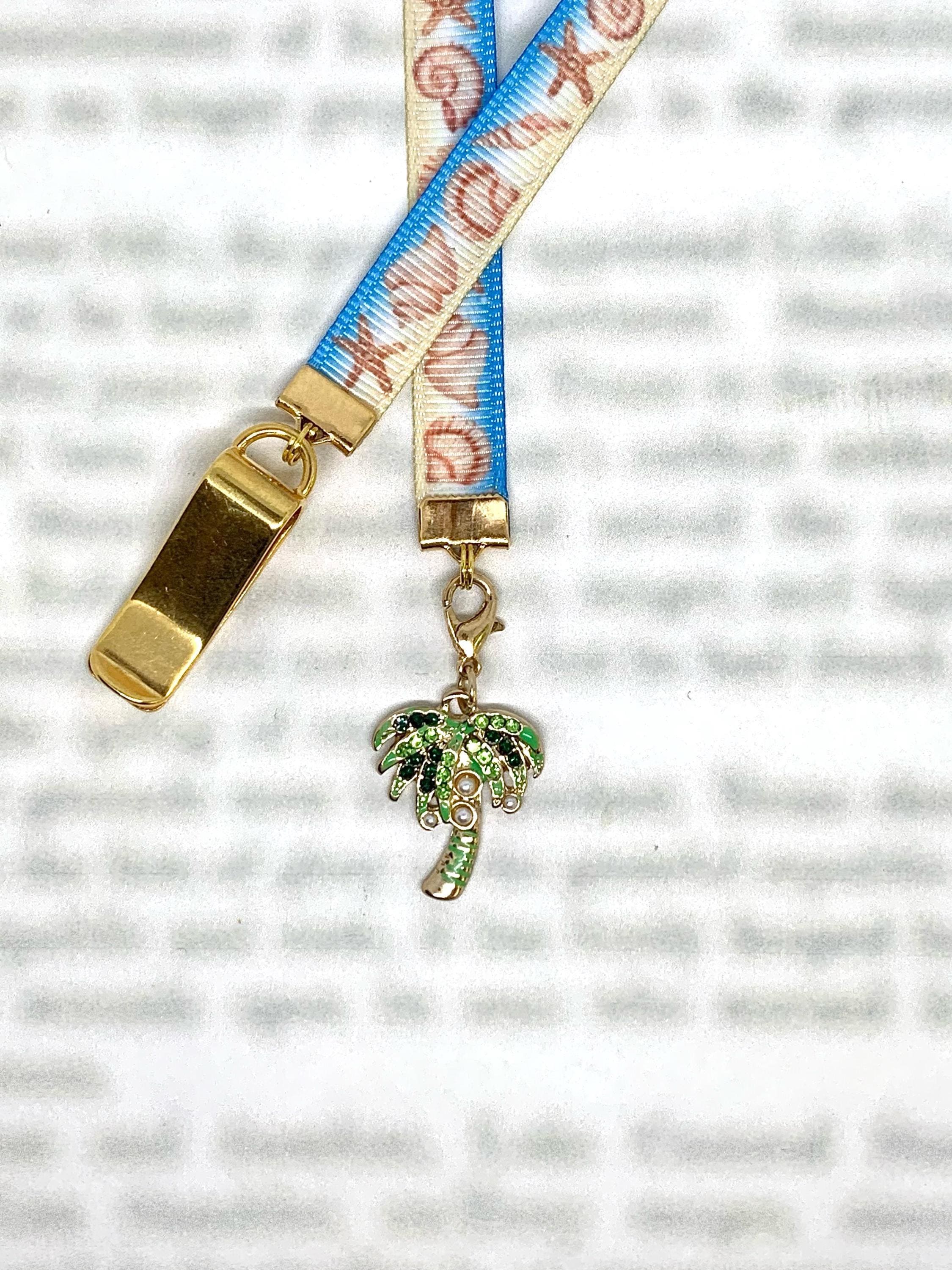 Palm Tree bookmark by Charming Book Clips. My patented design featuring a special gold plated clip that attaches to your book cover so you never lose your bookmark. Just slide the clip onto the cover of a paperback or the binding of a hardcover when you start your book, then mark the page with the ribbon.