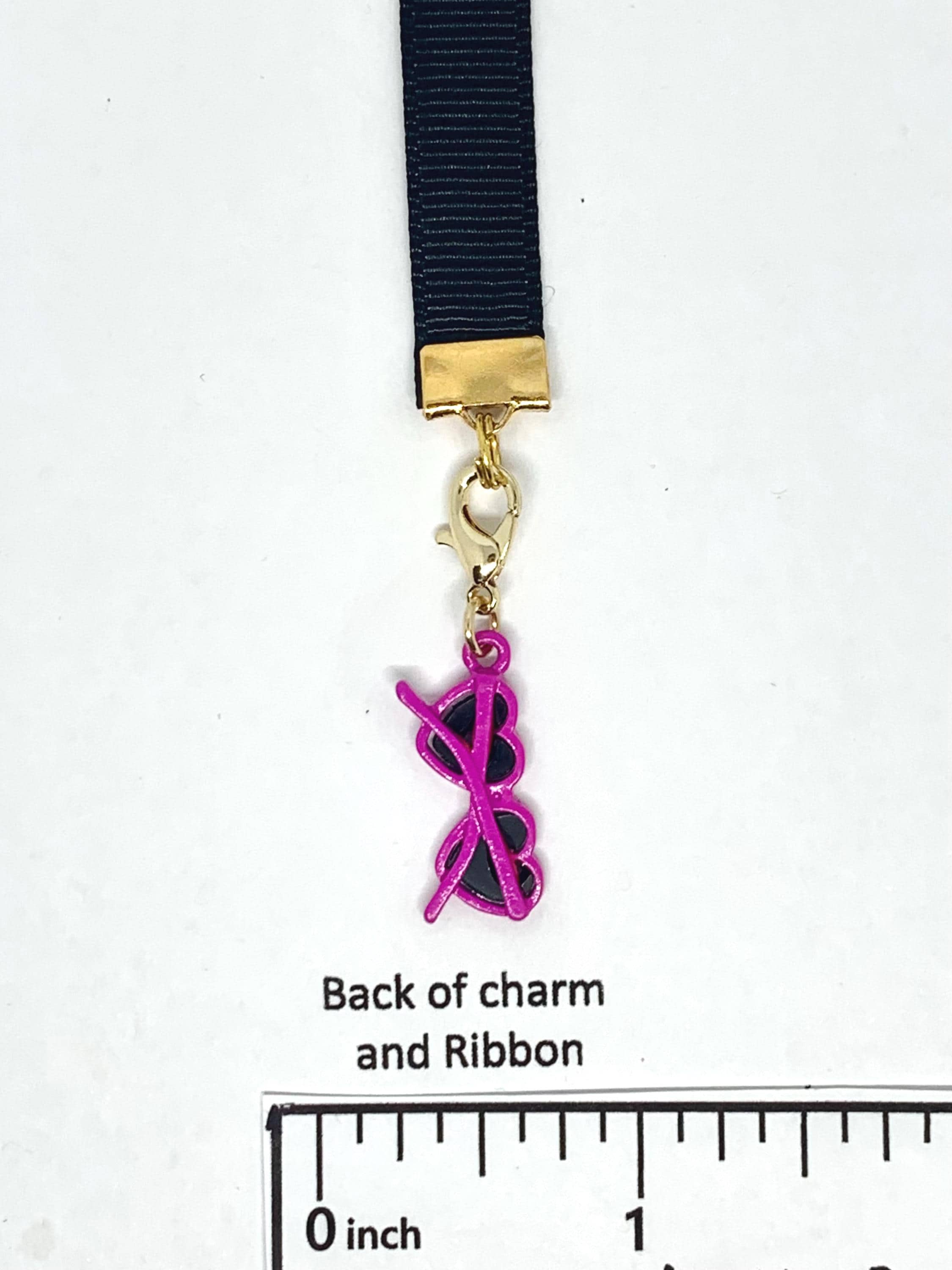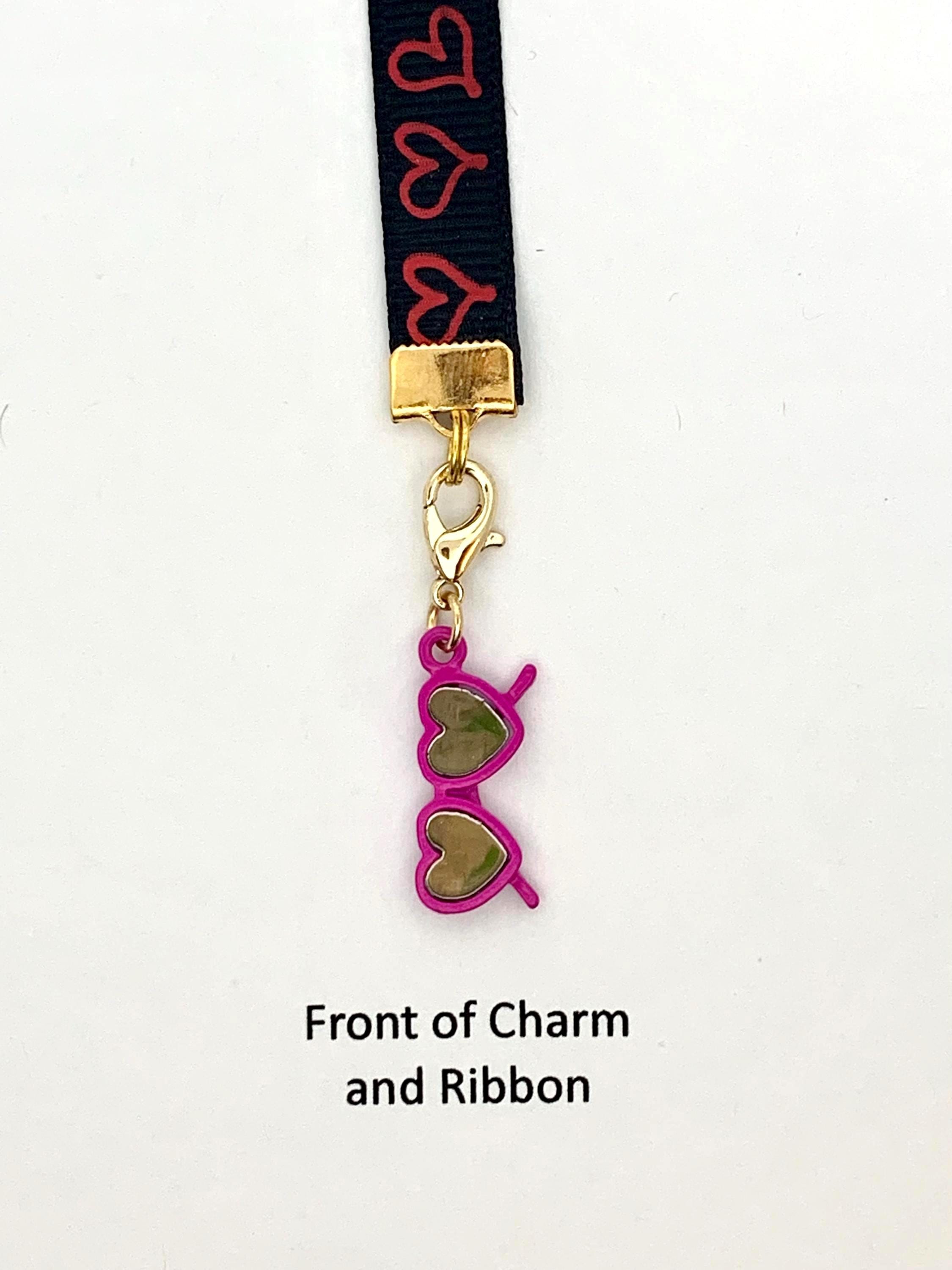 For fans of that playful, confident vibe of "22" this Heart Shaped Sunglasses charm is right on brand with mirror like lenses and set in gold tone. The ribbon is a black grosgrain with a red heart silhouette print, 3/8" wide and is approximately 12” in length to accommodate various book sizes.