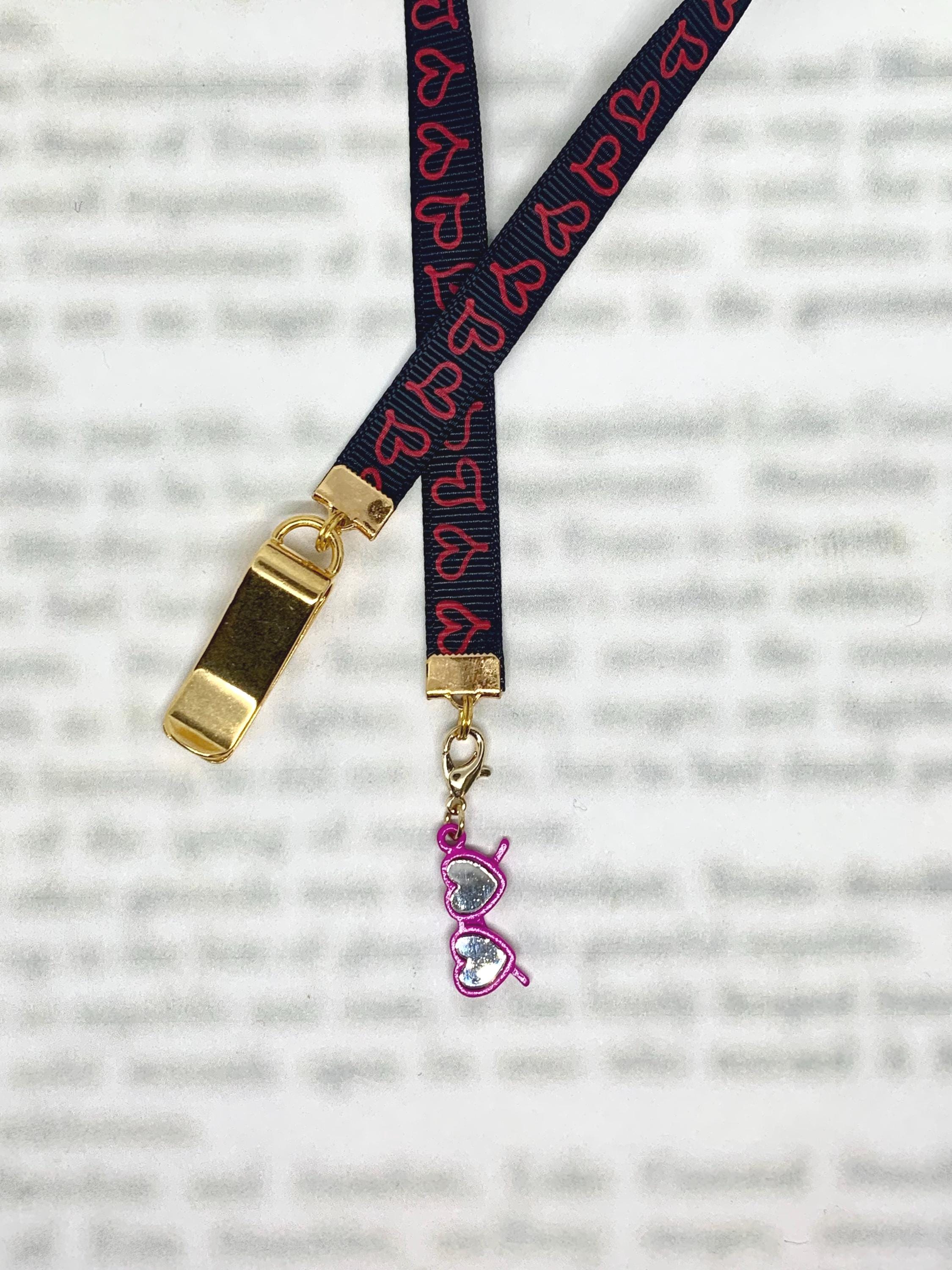 Heart Shaped Sunglasses bookmark by Charming Book Clips. My patented design featuring a special gold plated clip that attaches to your book cover so you never lose your bookmark. Just slide the clip onto the cover of a paperback or the binding of a hardcover when you start your book, then mark the page with the ribbon.