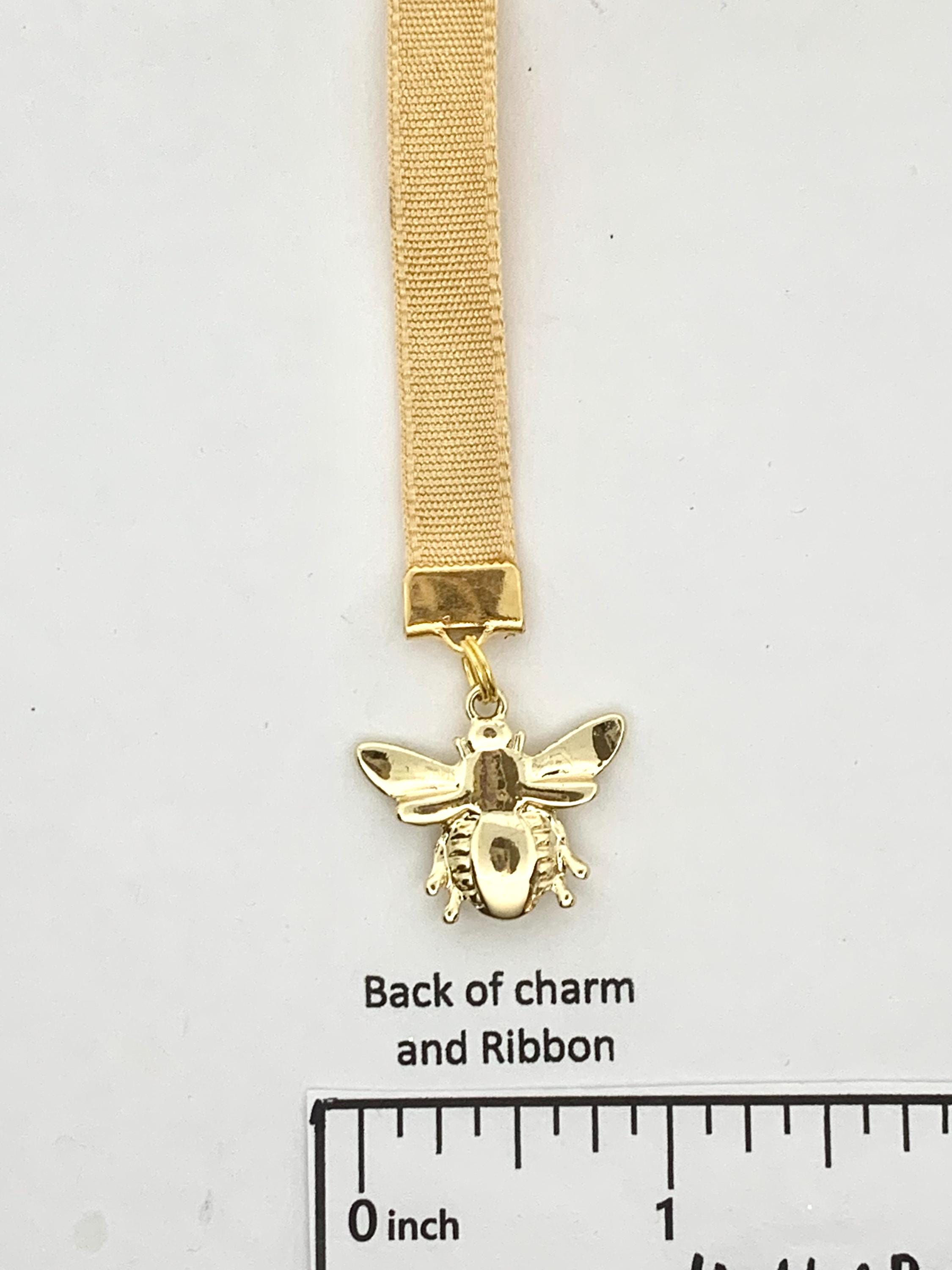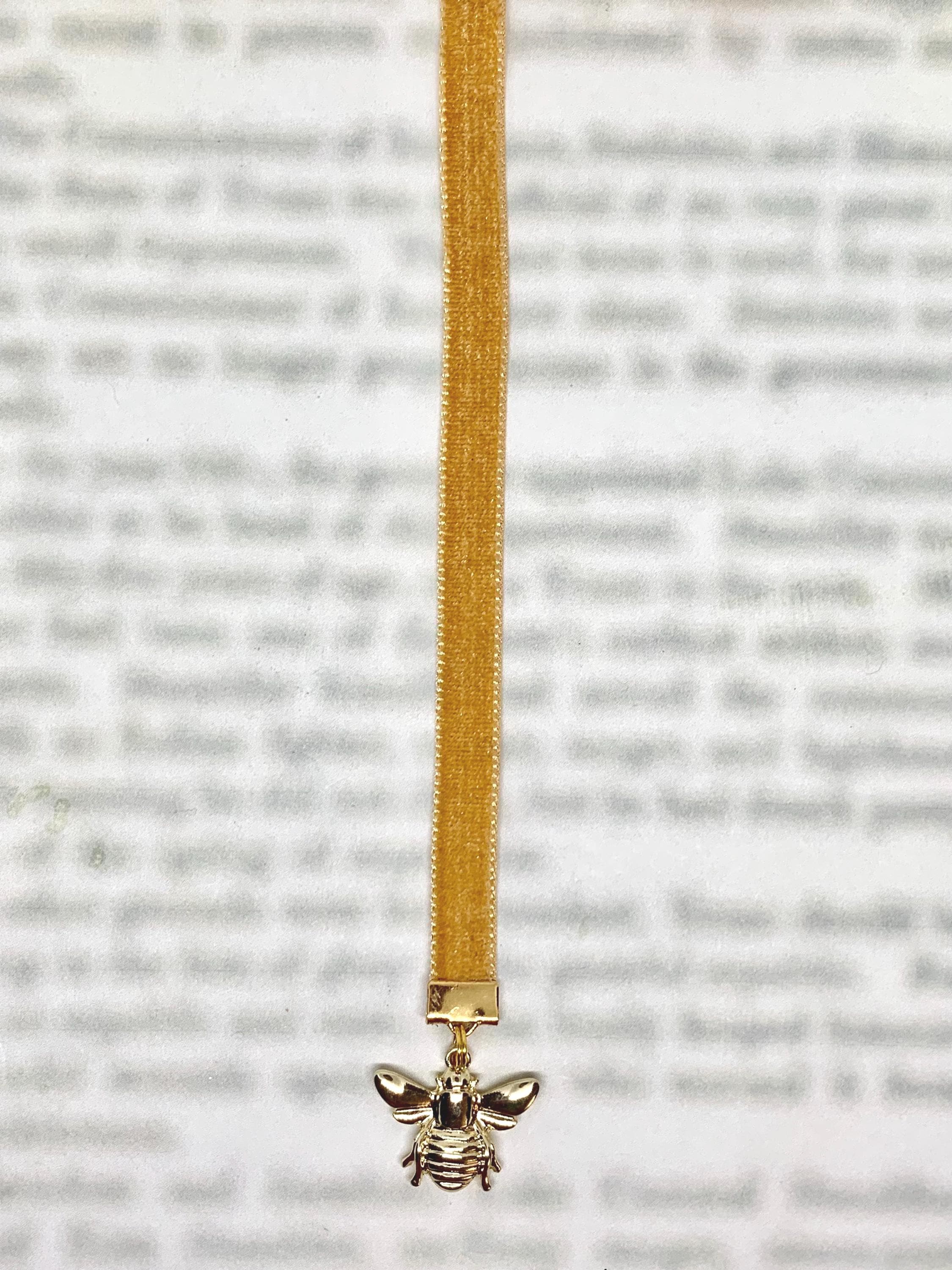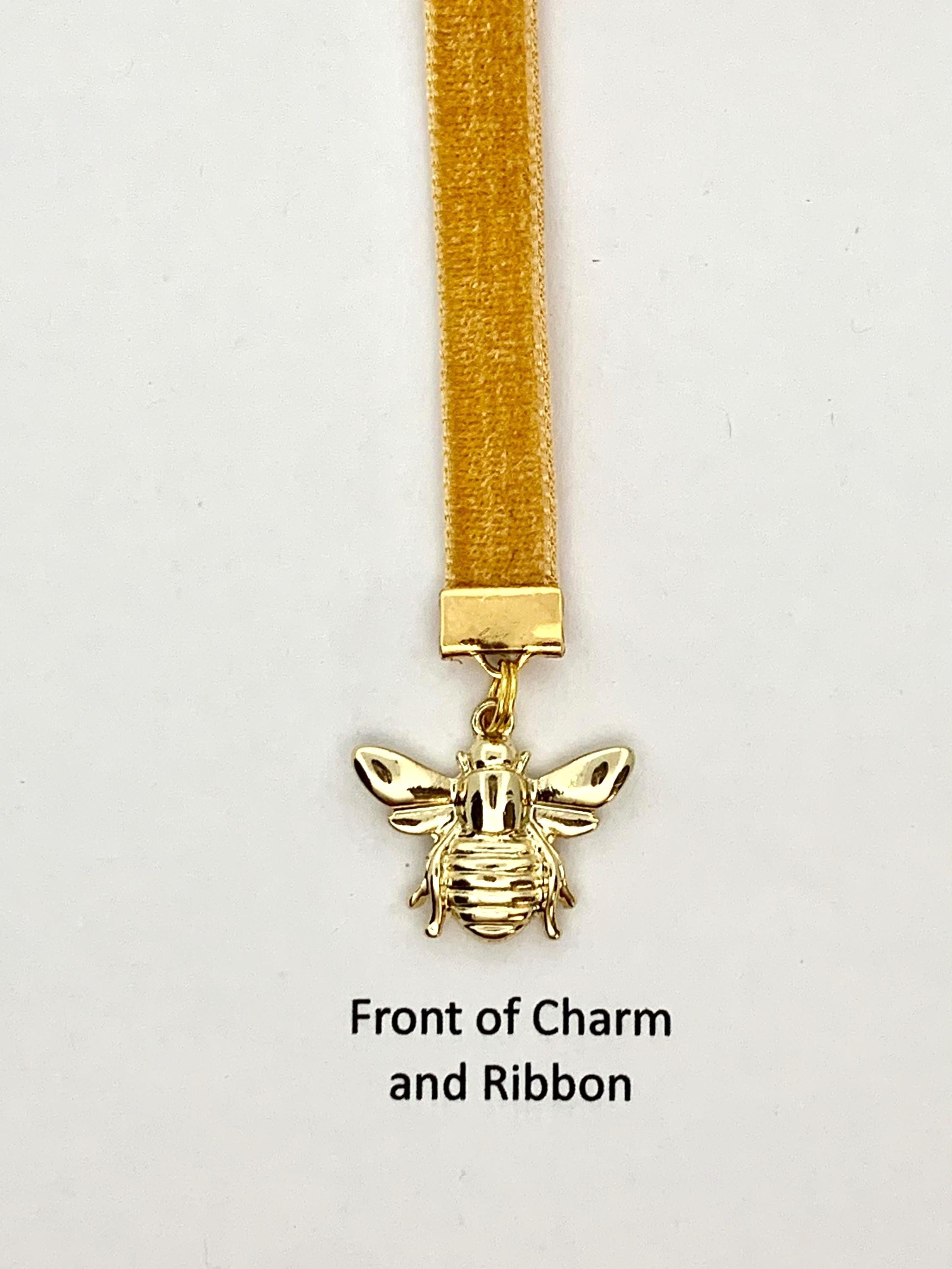 This beautiful gold-plated bee charm visiting a field of flowers is sure to bring a smile to your face. Ribbon is a soft honey colored velvet and is 3/8" wide and approximately 12” in length to accommodate various book sizes.