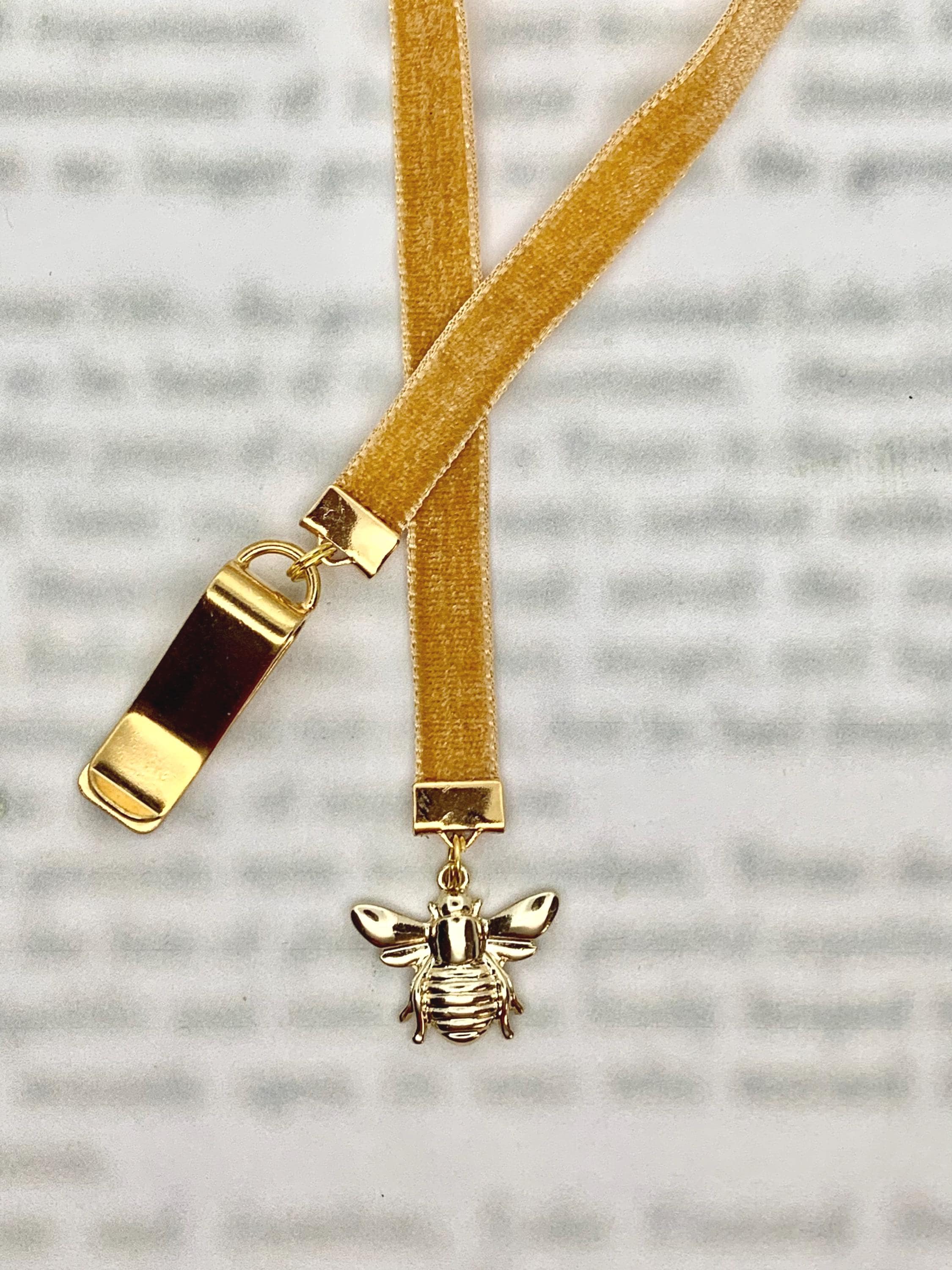 Bee bookmark by Charming Book Clips. My patented design featuring a special gold plated clip that attaches to your book cover so you never lose your bookmark. Just slide the clip onto the cover of a paperback or the binding of a hardcover when you start your book, then mark the page with the ribbon.