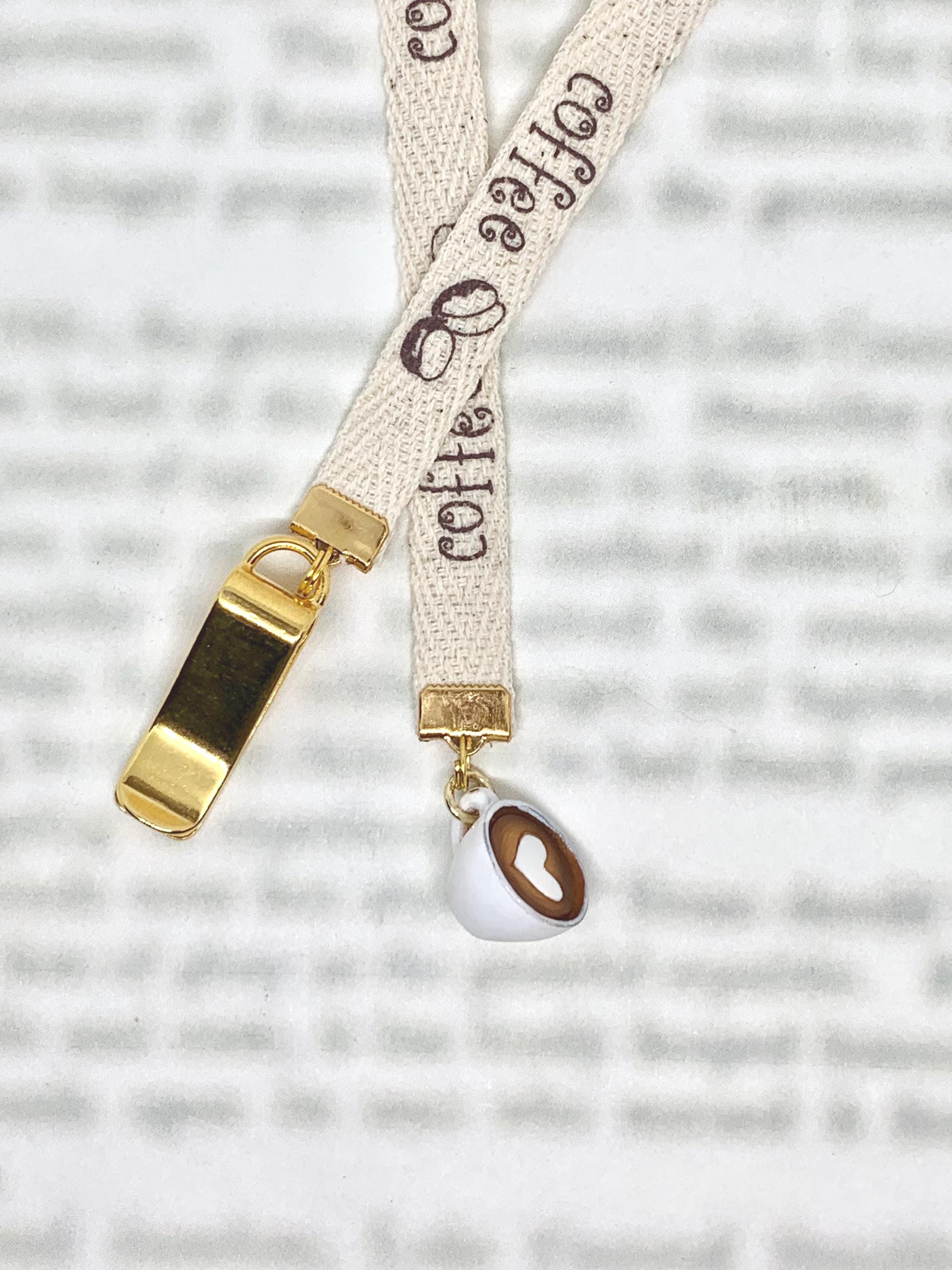 Coffee Cup Latte bookmark by Charming Book Clips. My patented design featuring a special gold plated clip that attaches to your book cover so you never lose your bookmark. Just slide the clip onto the cover of a paperback or the binding of a hardcover when you start your book, then mark the page with the ribbon.