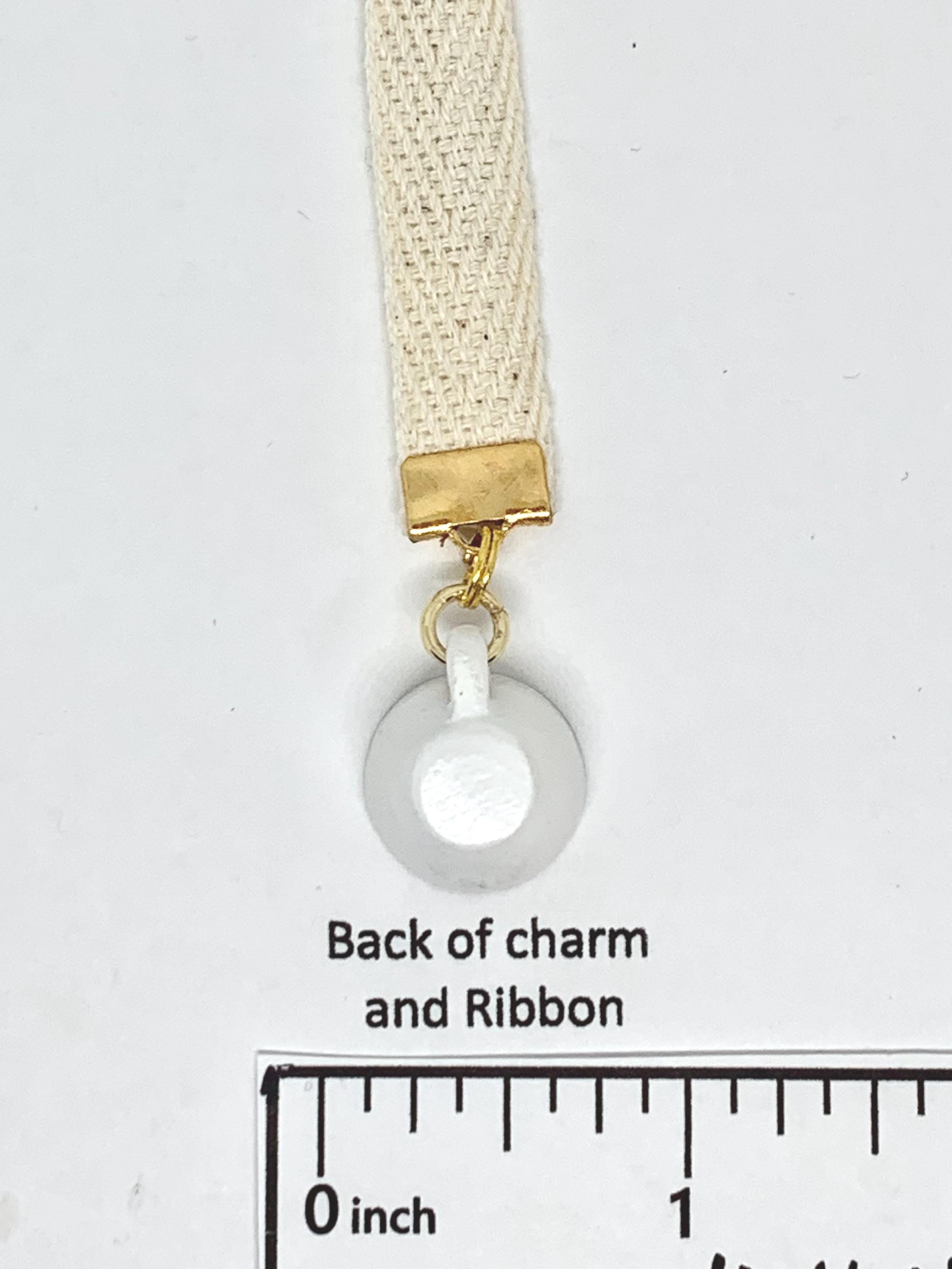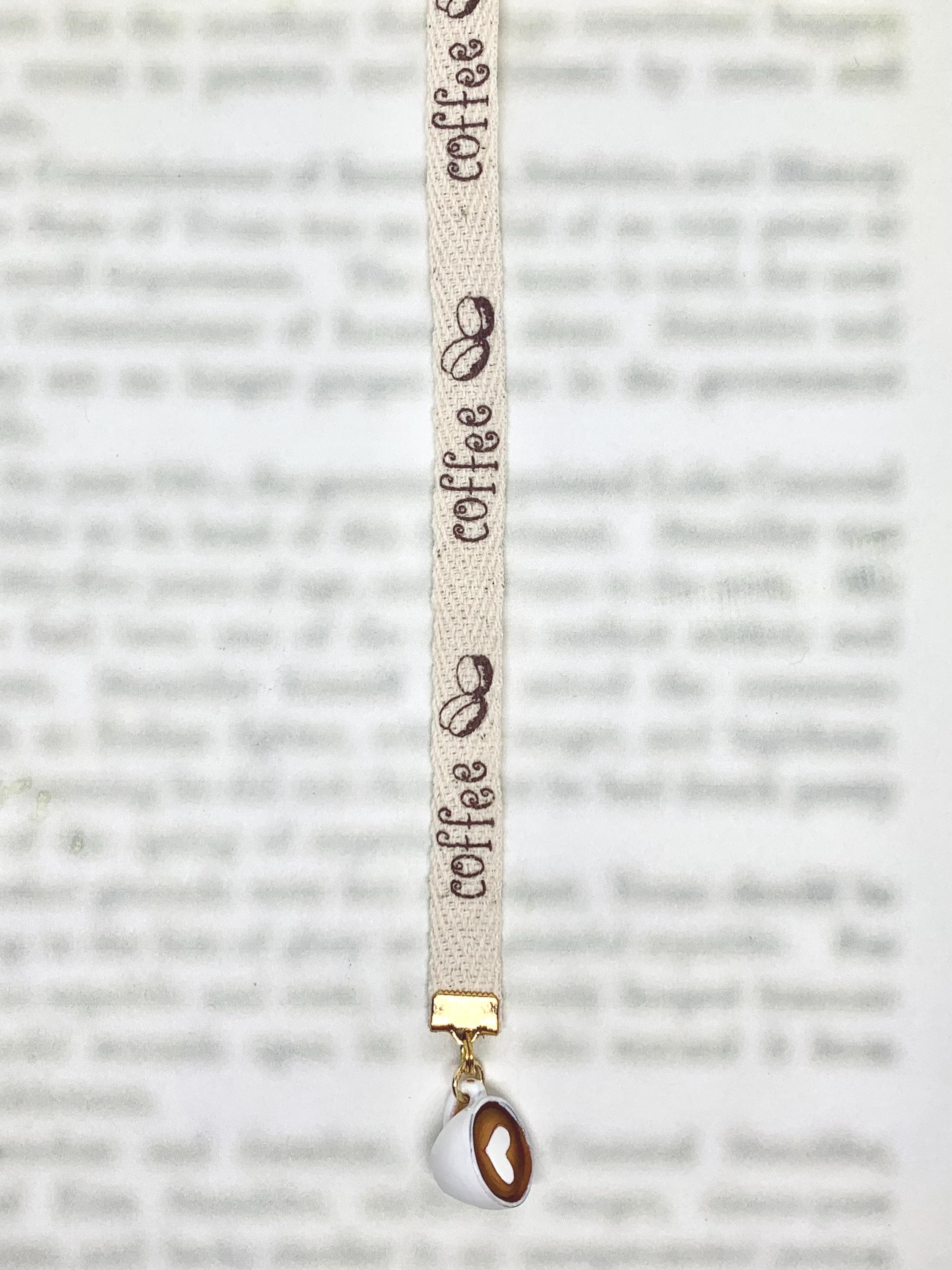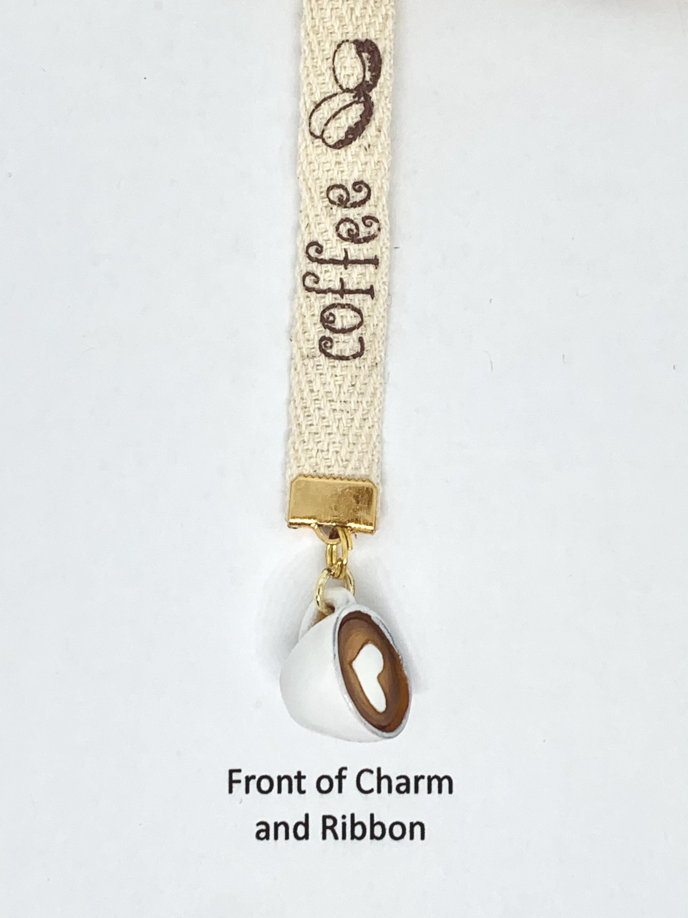 You love stopping at your local cafe for a rejuvenating cup of your favorite hot beverage. This barista worthy coffee cup charm with a "foam art" heart will give you that ahh feeling. The ribbon is a natural colored fabric printed with the word coffee and coffee beans in dark brown, 3/8" wide and is approximately 12” in length to accommodate various book sizes.