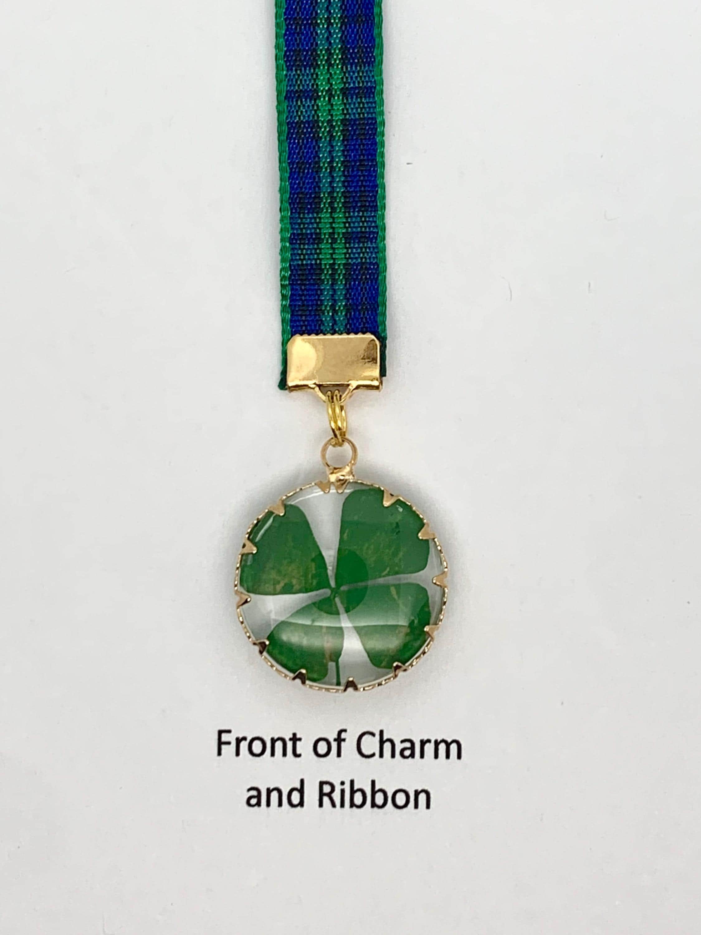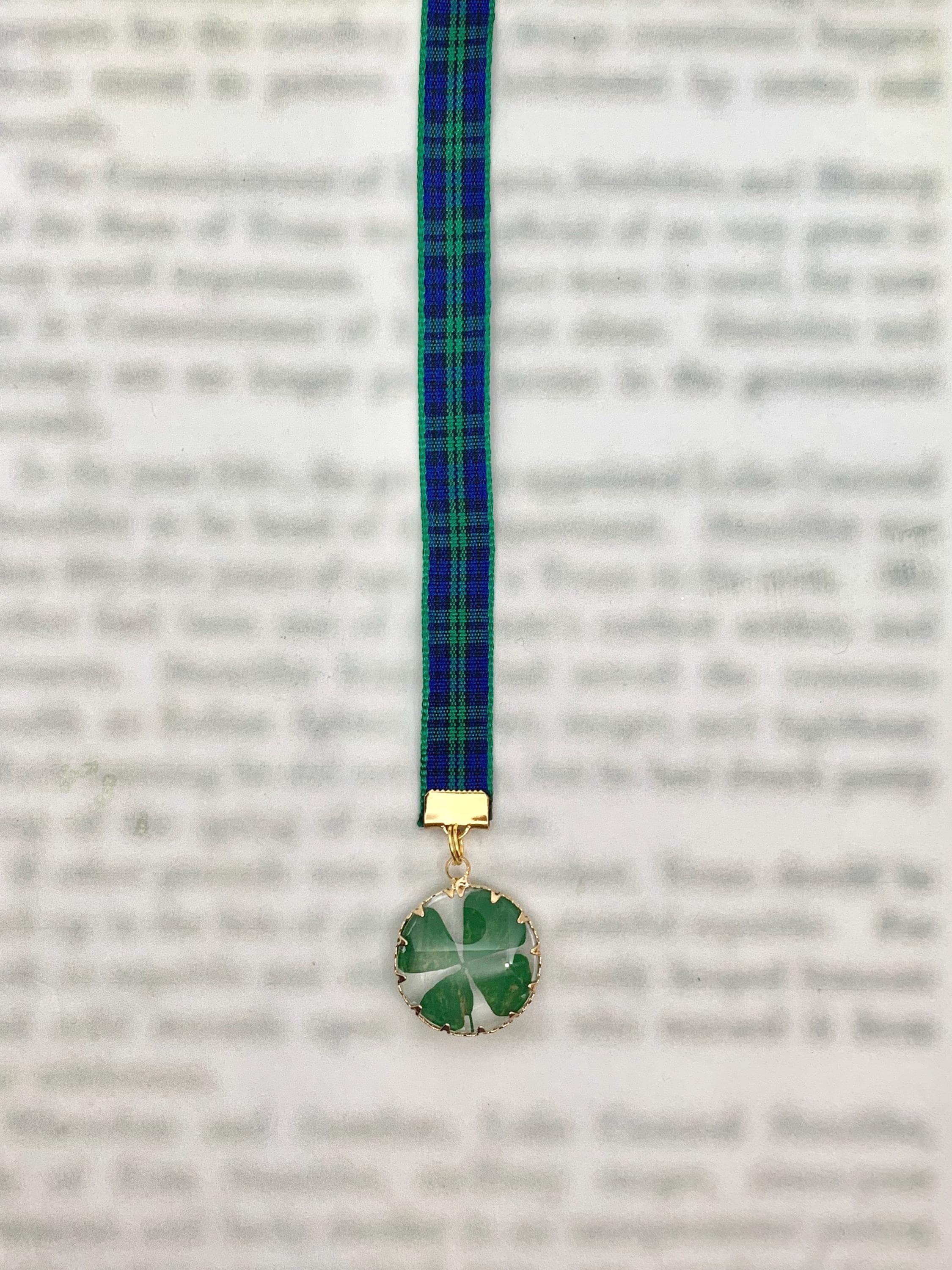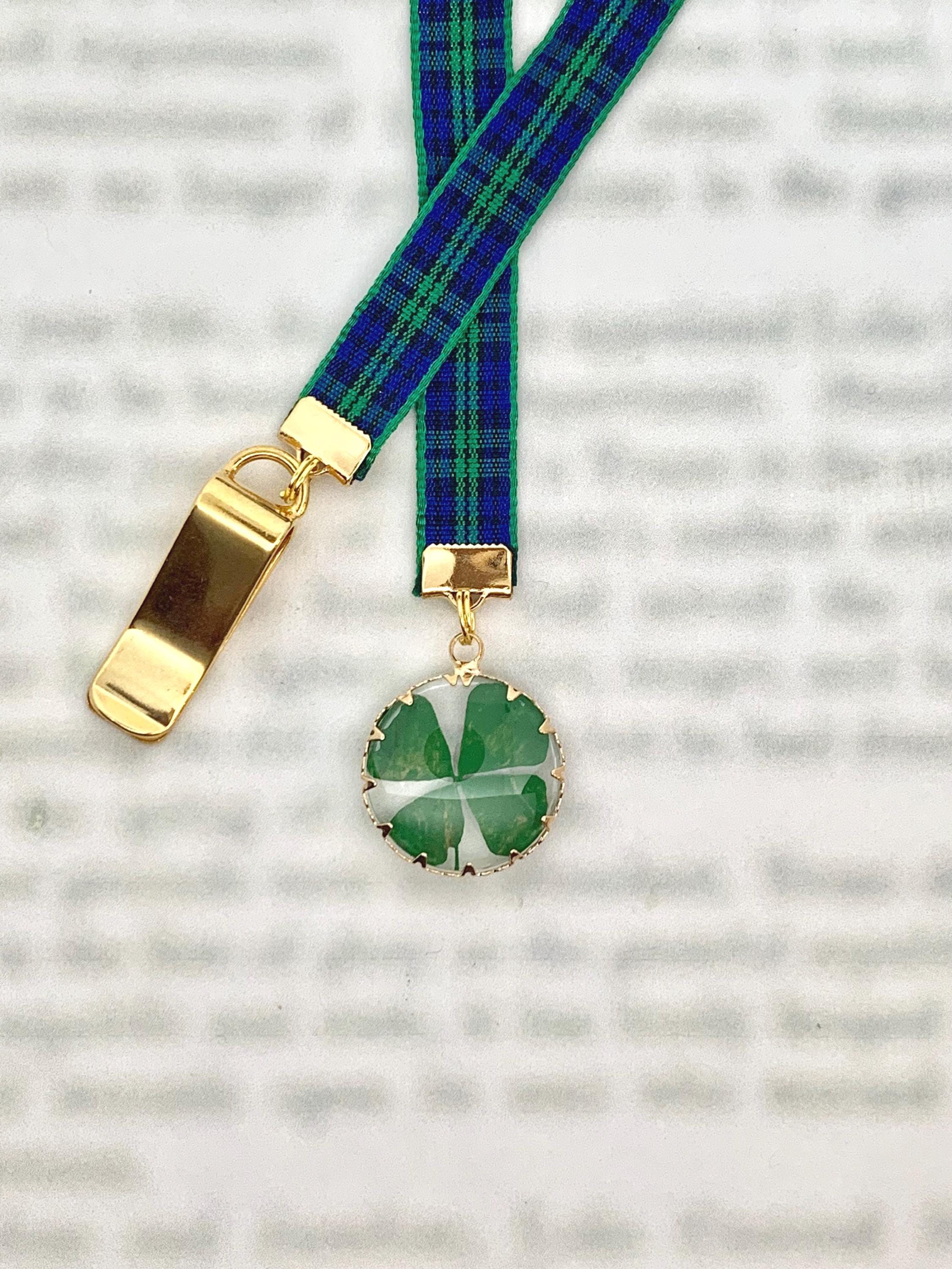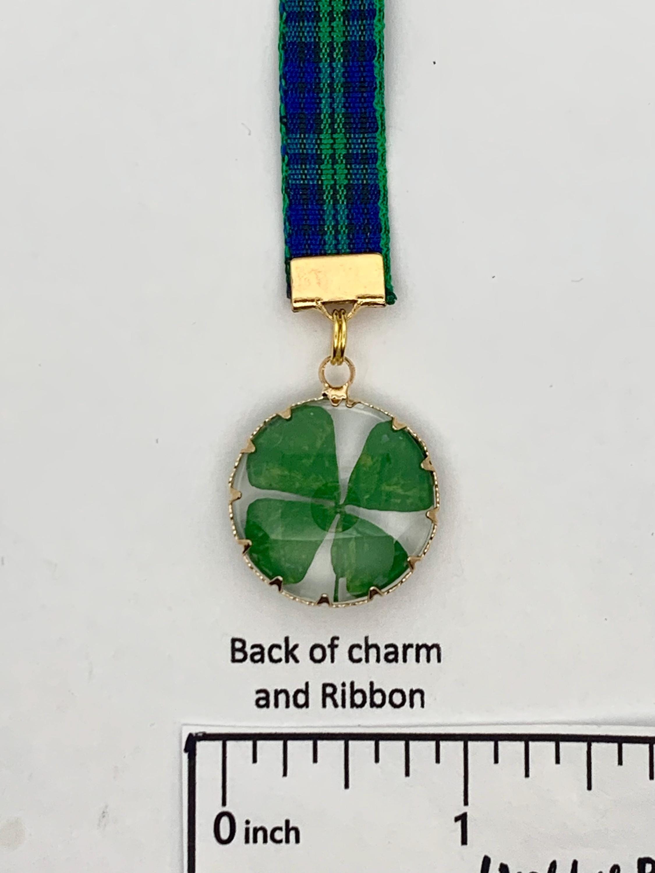 Lucky you to find this four leaf clover captured in resin and framed in gold-plate. The ribbon is a navy and green blackwatch plaid , 3/8" wide and is approximately 12” in length to accommodate various book sizes.