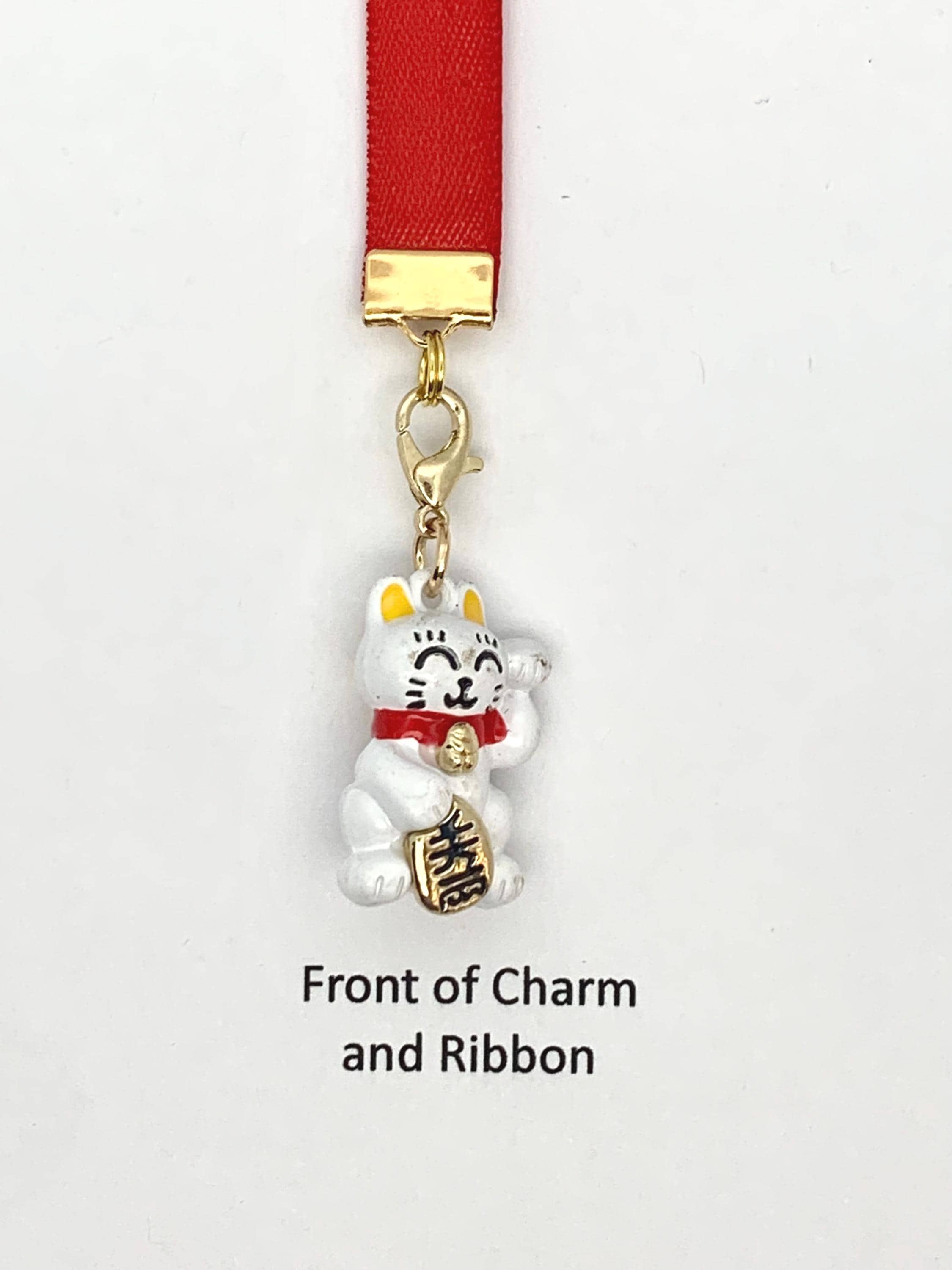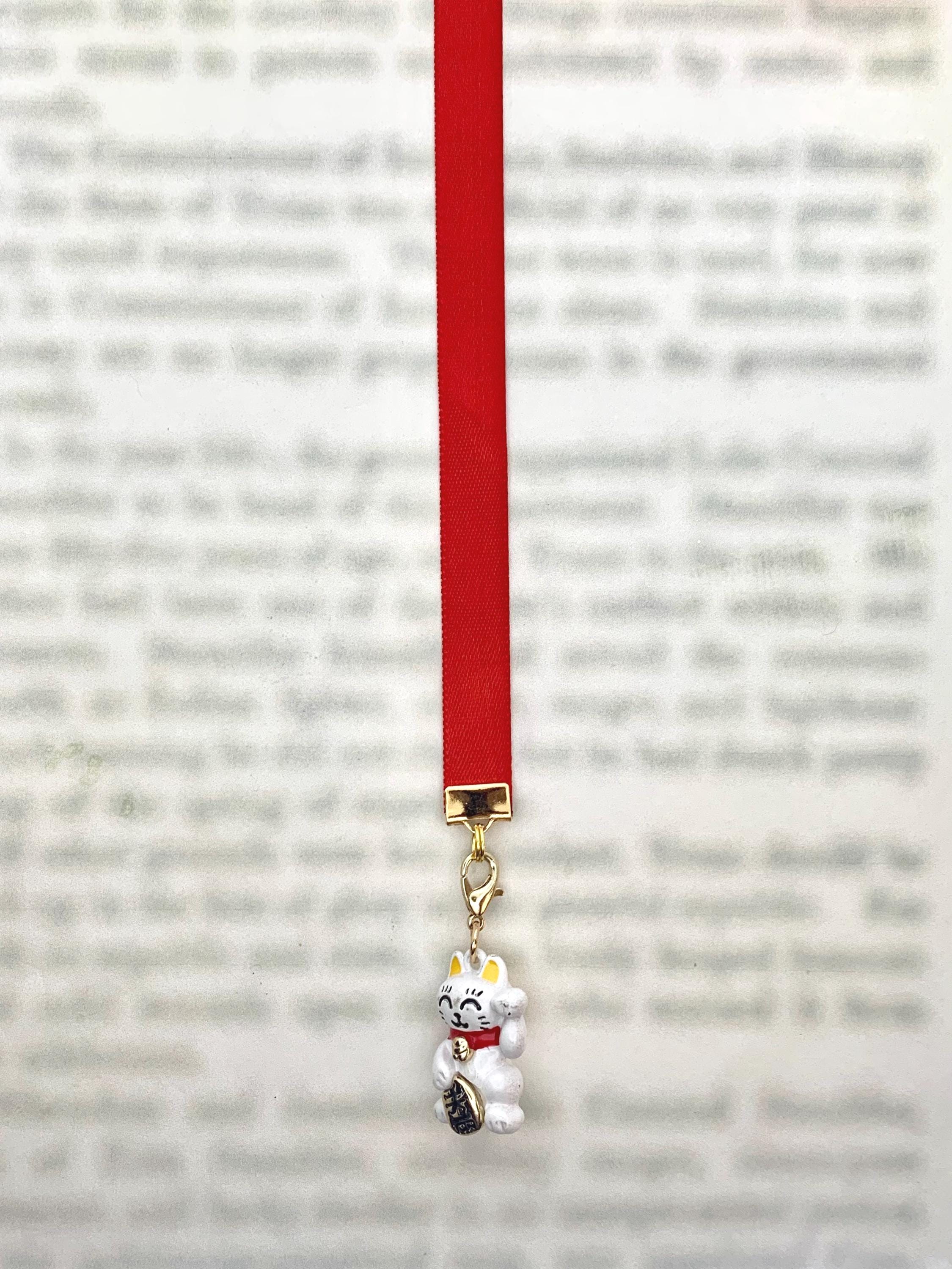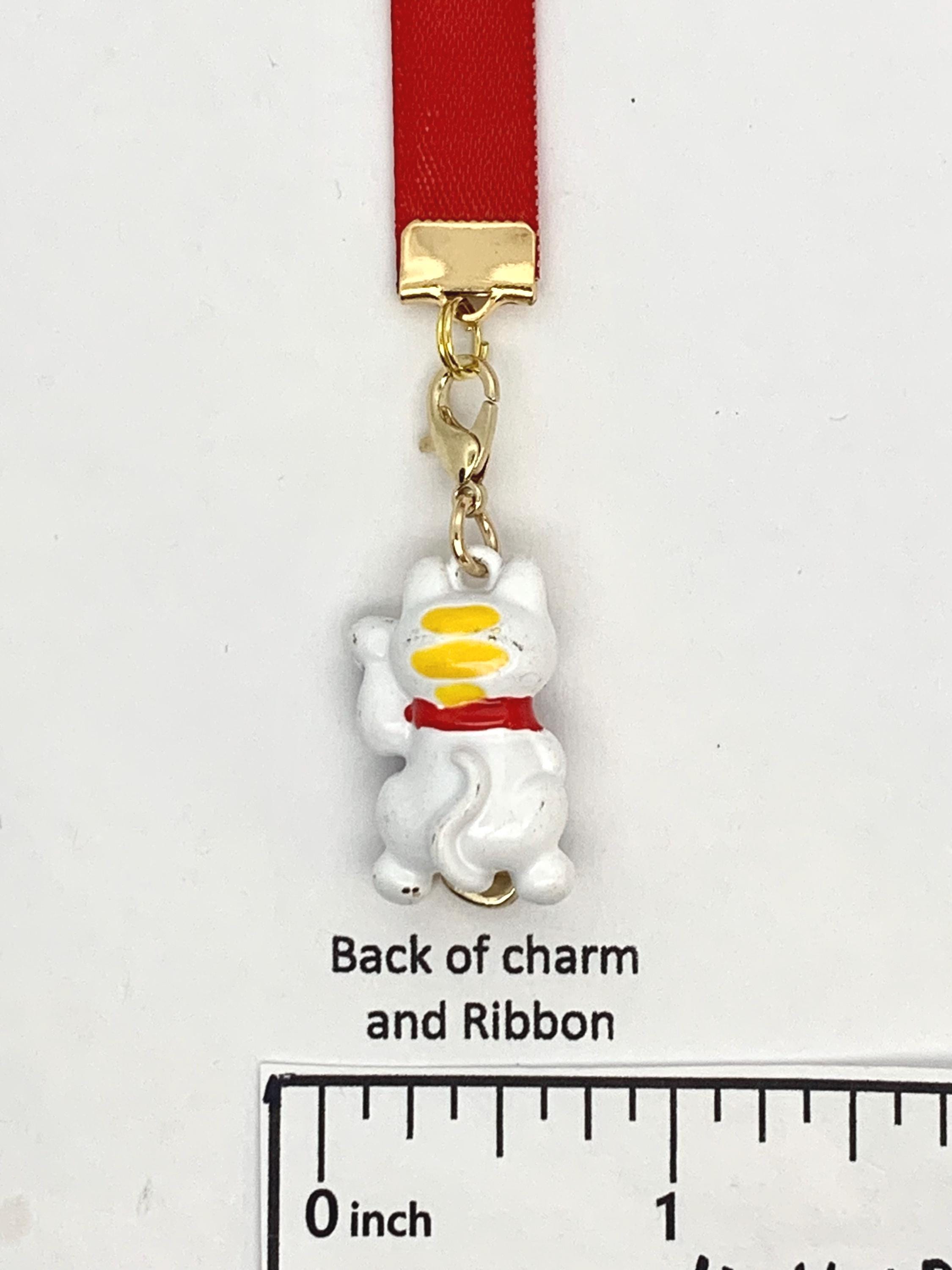 The "lucky cat" figurine, or maneki-neko, is a Japanese symbol placed in Chinese restaurants to invite good fortune and welcome customers. This adorable enamel charm set in gold tone will remind you of one of your favorite takeouts. The ribbon is a red satin, 3/8" wide and is approximately 12” in length to accommodate various book sizes.