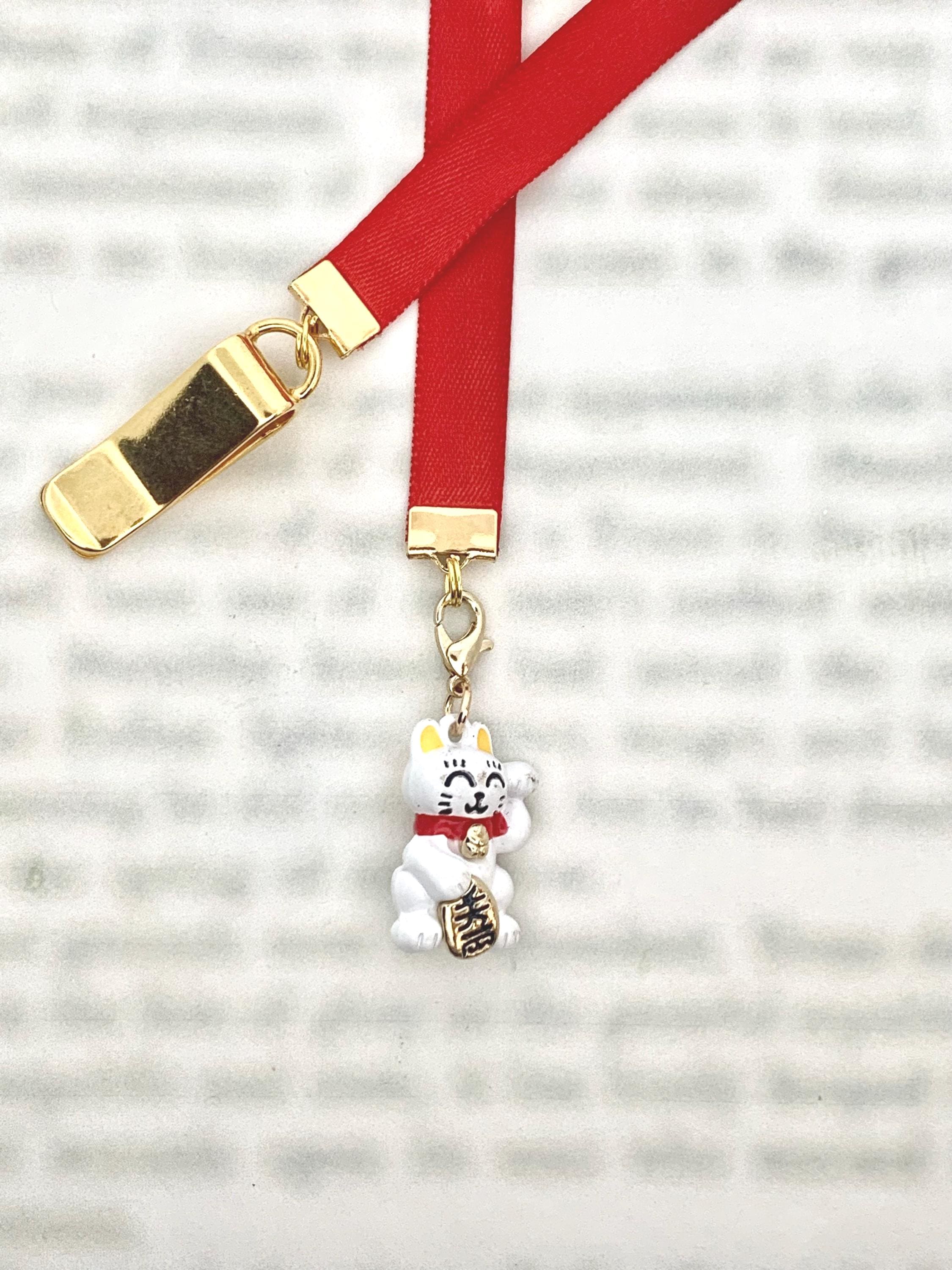 Lucky Cat Enamel bookmark by Charming Book Clips. My patented design featuring a special gold plated clip that attaches to your book cover so you never lose your bookmark. Just slide the clip onto the cover of a paperback or the binding of a hardcover when you start your book, then mark the page with the ribbon.