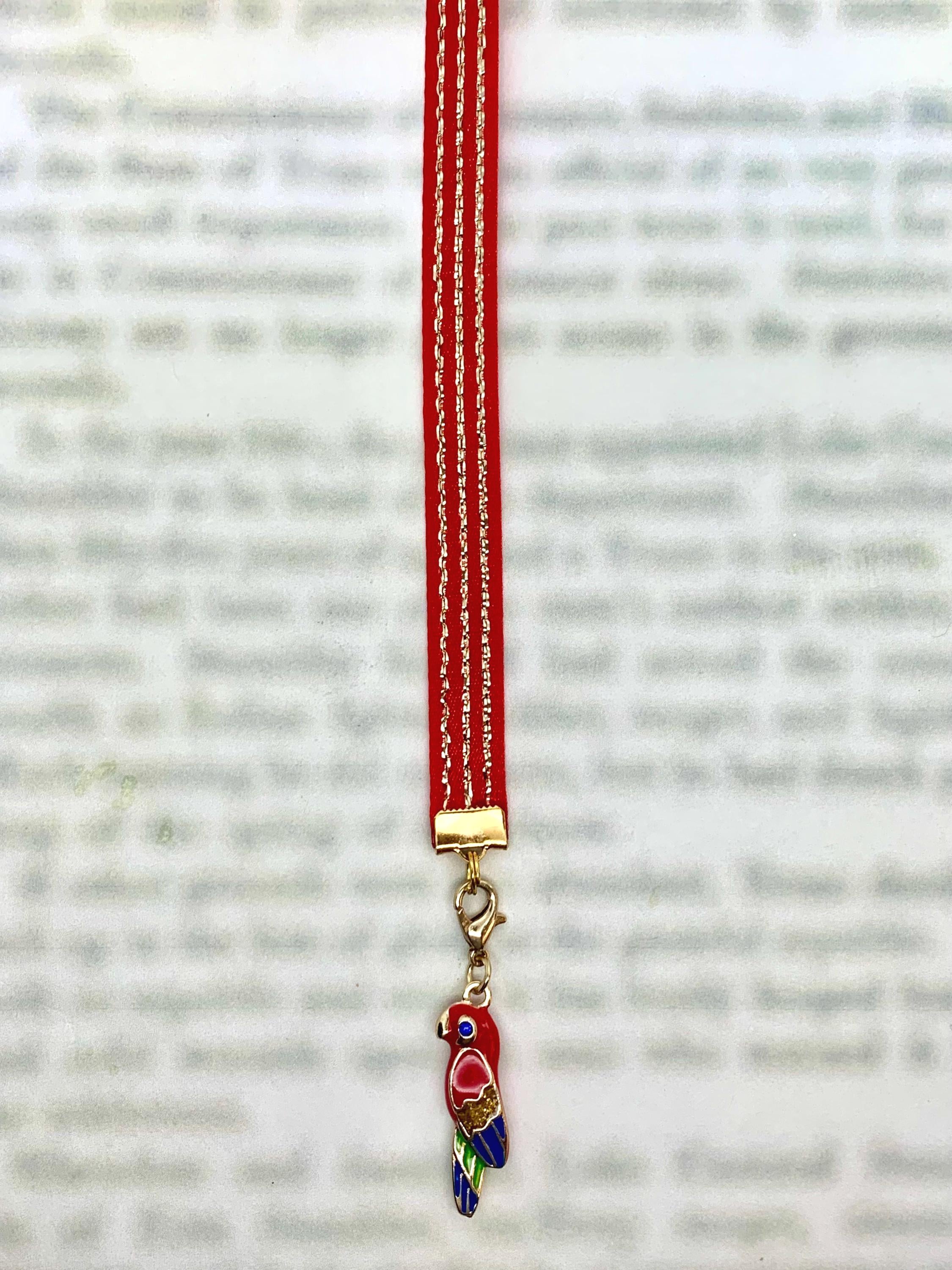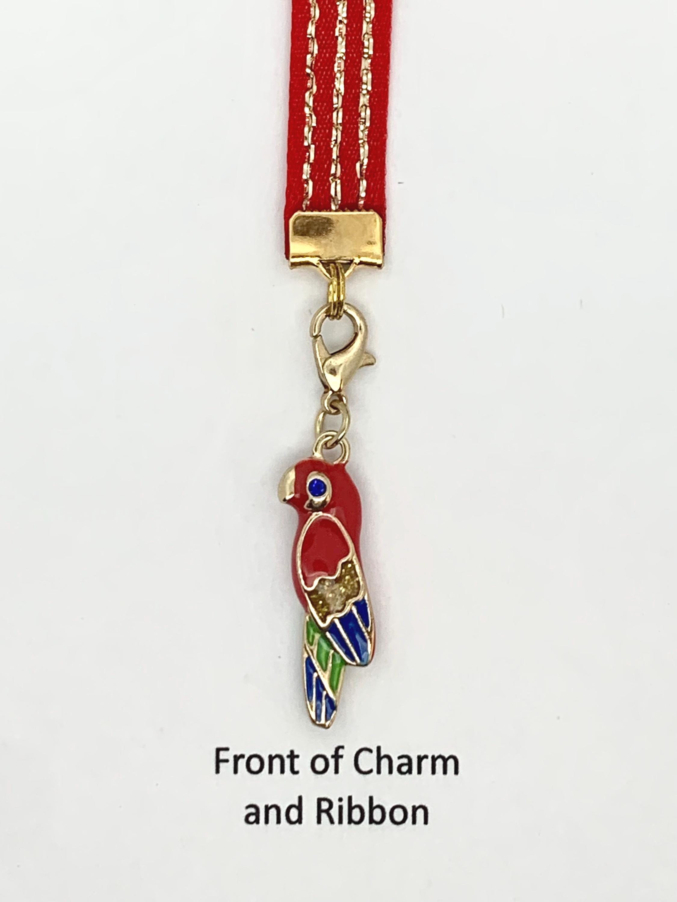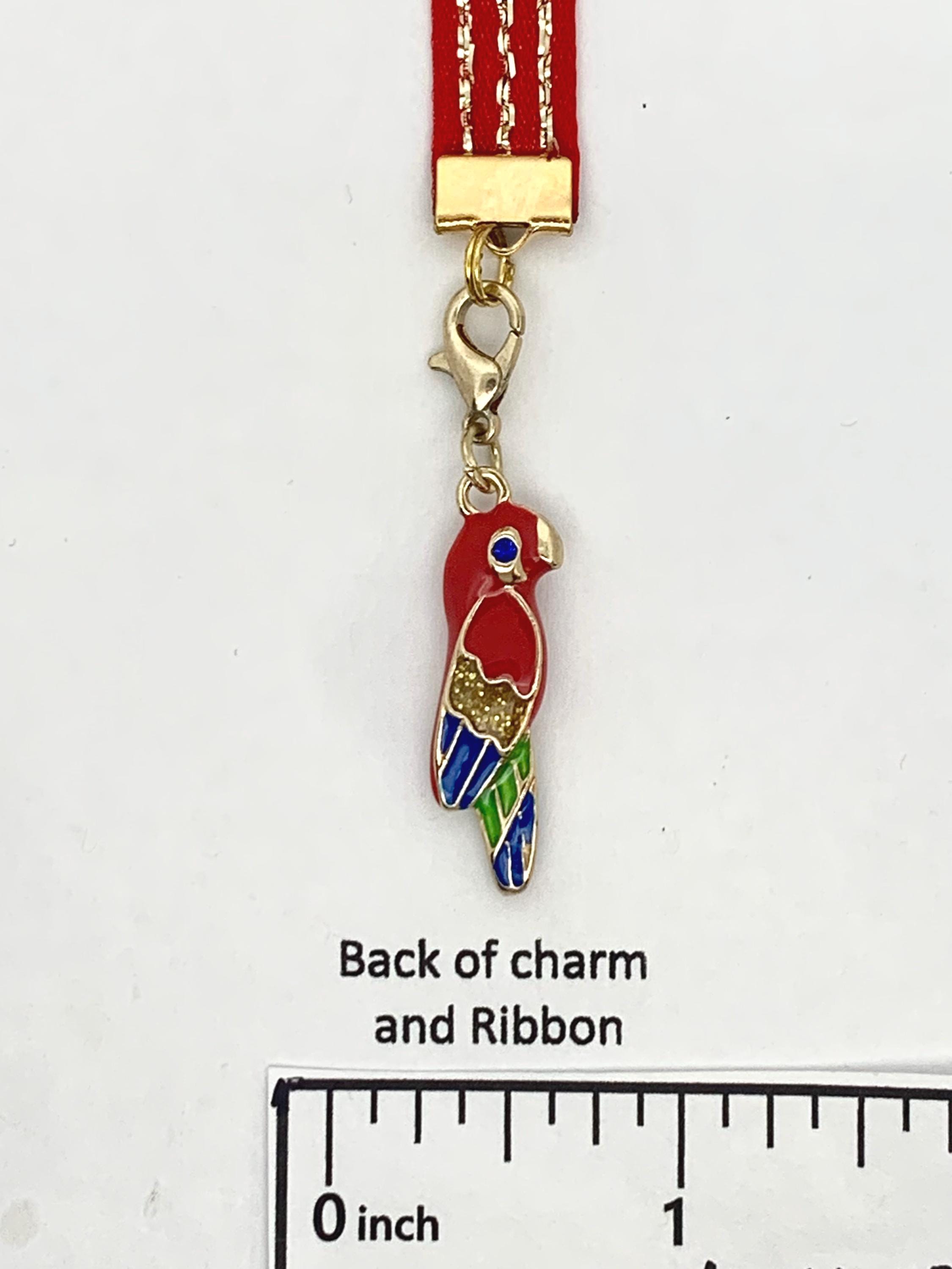 Macaws are magnificent tropical birds with colorful wings. Let this Macaw charm bookmark perch on your book. The charm is bright enamel with crystal accents on the wing and a blue crystal for the eye, set on gold tone. The ribbon is a red satin with gold stitch lines and is 3/8" wide and is approximately 12” in length to accommodate various book sizes.