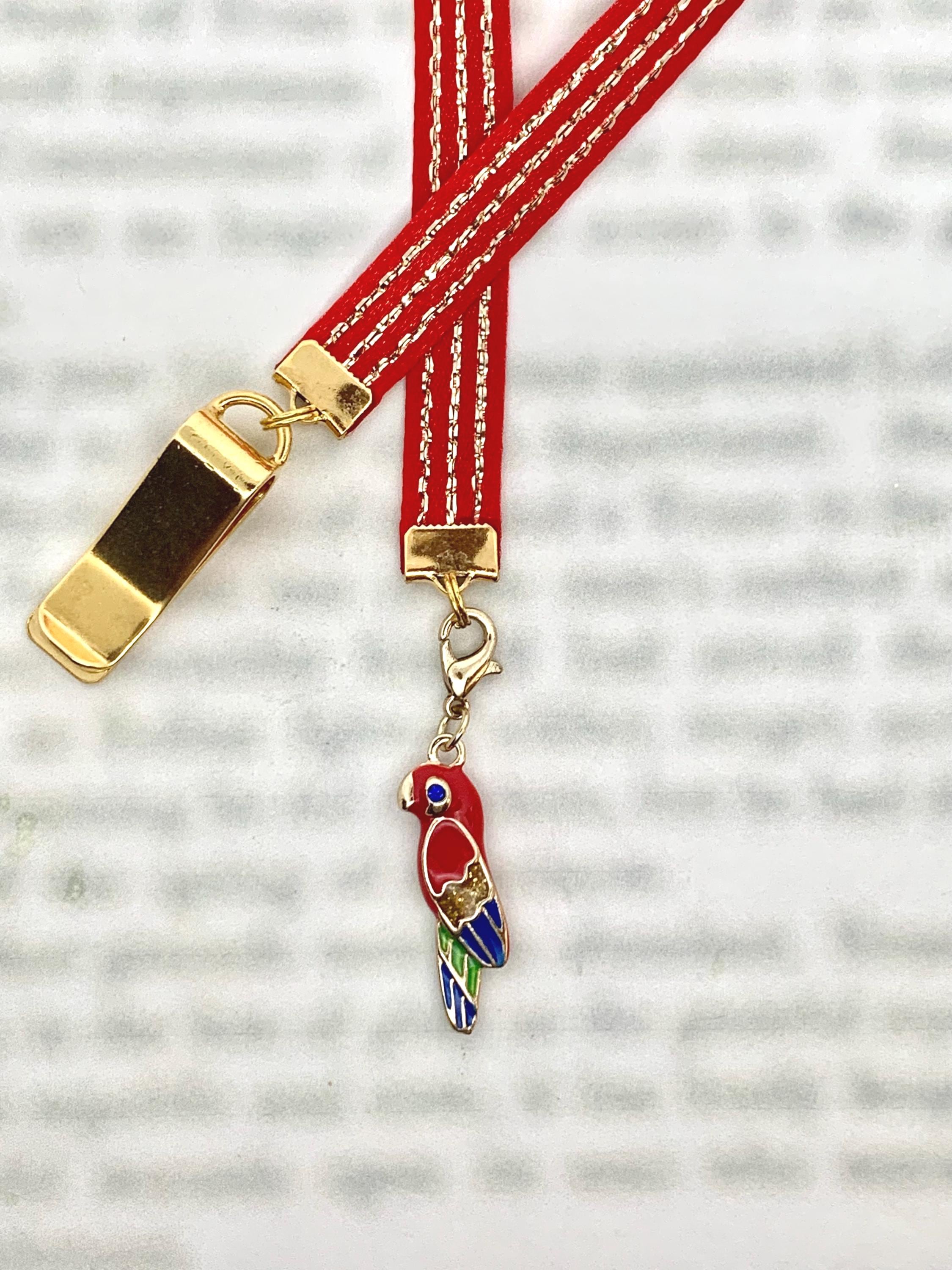Parrot bookmark by Charming Book Clips. My patented design featuring a special gold plated clip that attaches to your book cover so you never lose your bookmark. Just slide the clip onto the cover of a paperback or the binding of a hardcover when you start your book, then mark the page with the ribbon.