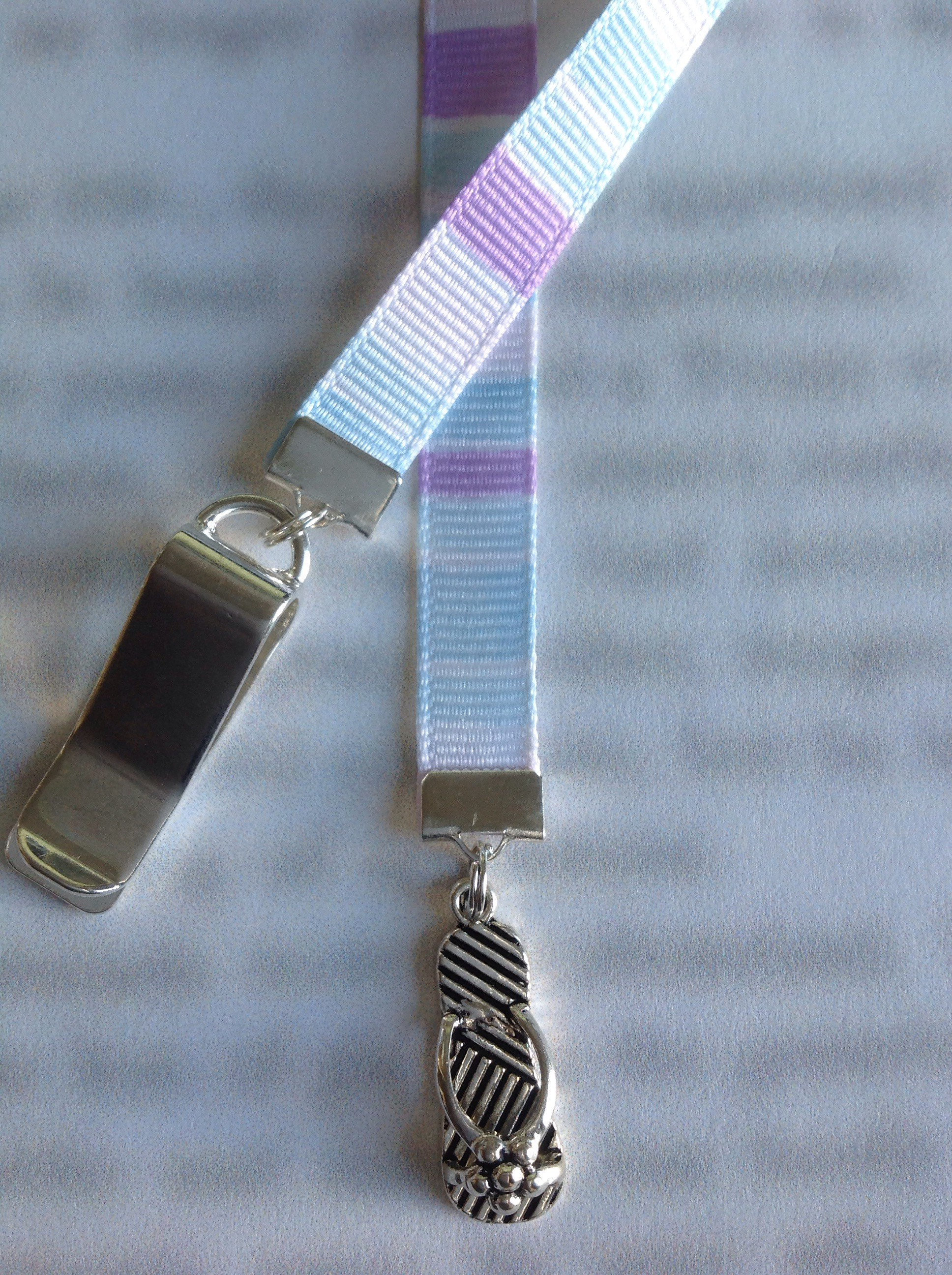 Flip Flop bookmark by Charming Book Clips. My super fun and functional patented ribbon with charm bookmarks feature a special silver clip that attaches to your book cover so you never lose your bookmark. Just slide the clip onto the cover of a paperback or the binding of a hardcover when you start your book, then mark the page with the ribbon.