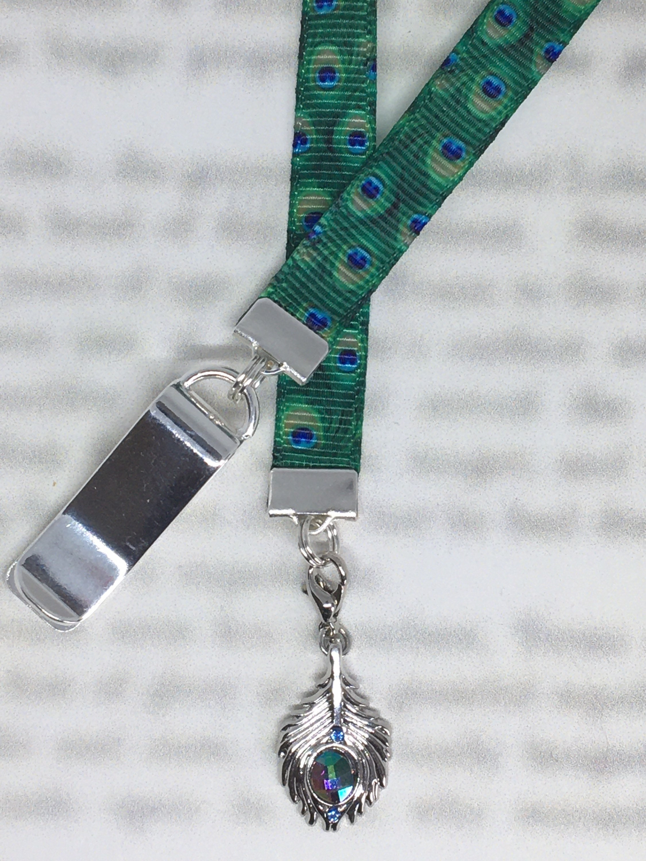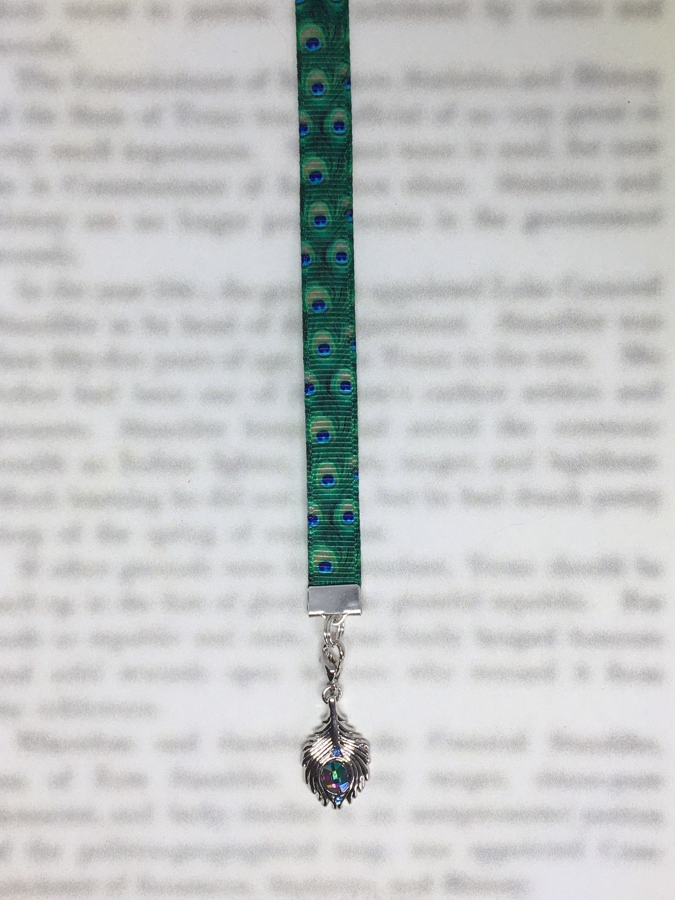 Peacock Feather bookmark by Charming Book Clips. My fun patented bookmark design features a silver plated clip that attaches to your book so you never lose your bookmark. Just slide the clip onto the cover of a paperback or the binding of a hardcover, mark your page with the ribbon.